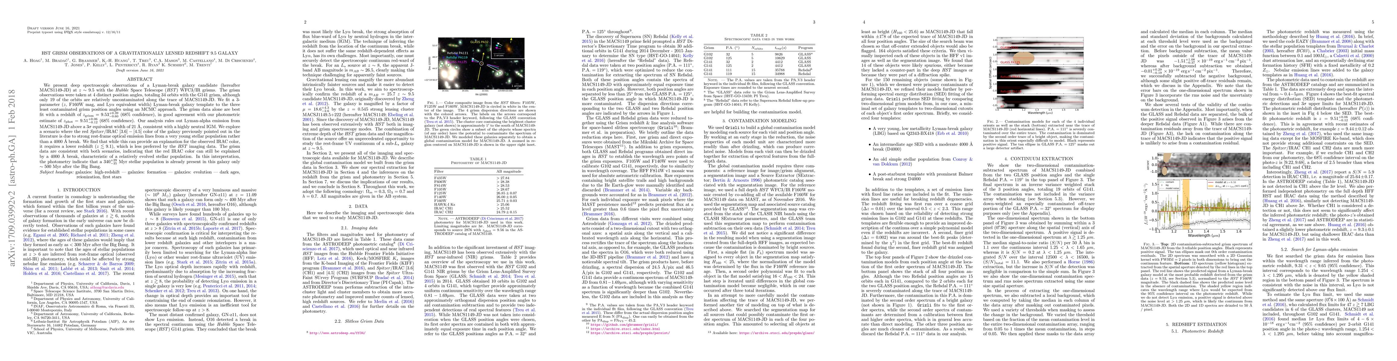 This paper reports spectroscopic observations of a Lyman-break galaxy candidate (MACS1149-JD) at $z\sim9.5$ using the HST grism, finding a redshift of $z_{\mathrm{grism}}=9.53^{+0.39}_{-0.60}$. The analysis suggests a highly neutral intergalactic medium and a $340^{+29}_{-35}$ Myr old stellar population, indicating significant evolution just 500 Myr after the Big Bang.