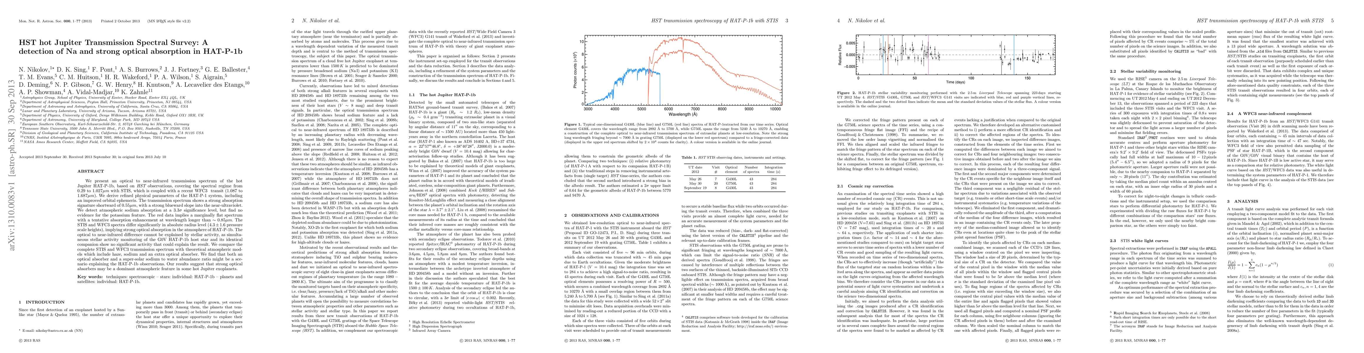 This study presents a detailed transmission spectrum of the hot Jupiter HAT-P-1b, revealing strong optical absorption and detecting sodium at a 3.3σ significance, while no potassium feature is found. The significant difference in radius levels between STIS and WFC3 spectra suggests strong optical absorption in the planet's atmosphere.