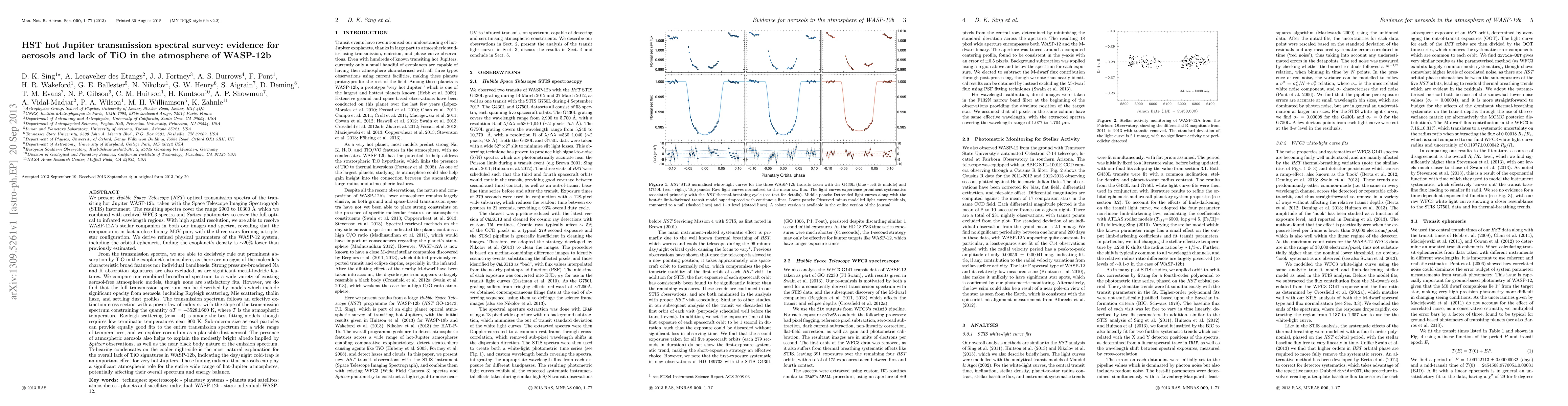 This paper reports on HST optical transmission spectra of the hot Jupiter WASP-12b, revealing the absence of TiO and other prominent molecular features, and suggesting the presence of aerosols instead. The data indicate that aerosols, including Rayleigh and Mie scattering, provide a better fit to the observed spectrum than aerosol-free models.