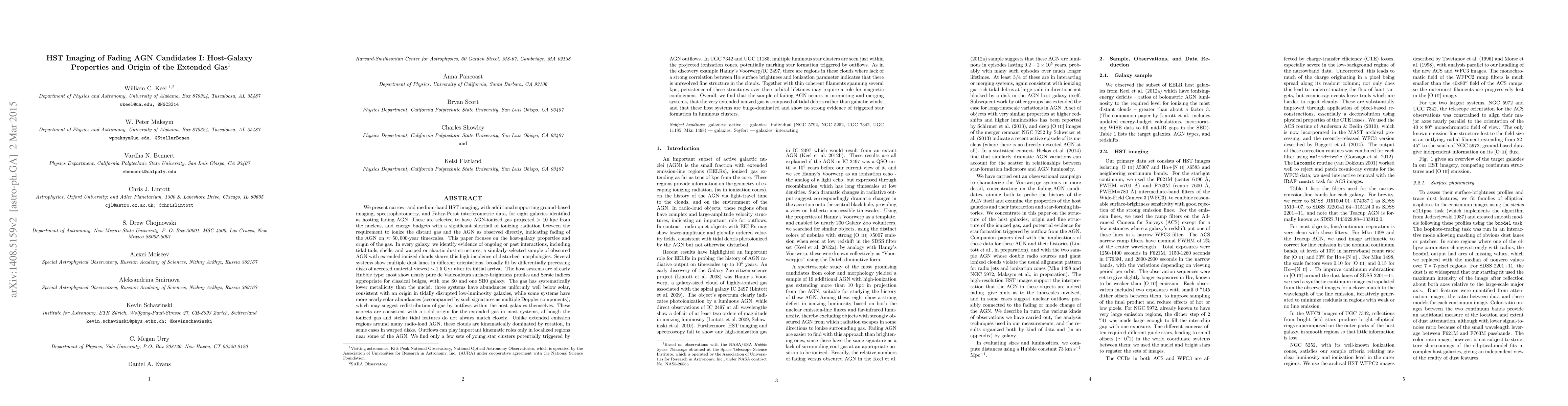 We present narrow- and medium-band HST imaging, with additional supporting ground-based data, for 8 galaxies identified as hosting fading AGN. These have AGN-ionized gas projected >10 kpc from the nucleus, and significant shortfall of ionizing radiation between the distant gas and the AGN, indicating fading AGN on ~50,000-year timescales. Every system shows evidence of ongoing or past interactions; a similar sample of obscured AGN with extended ionized clouds shares this incidence of disturbances. Several systems show multiple dust lanes in different orientations, broadly fit by differentially precessing disks of accreted material ~1.5 Gyr after initial arrival. The gas has lower metallicity than the nuclei; three systems have abundances uniformly well below solar, consistent with an origin in tidally disrupted low-luminosity galaxies, while some systems have more nearly solar abundances (accompanied by such signatures as multiple Doppler components), which may suggest redistribution of gas by outflows within the host galaxies themselves. These aspects are consistent with a tidal origin for the extended gas in most systems, although the ionized gas and stellar tidal features do not always match closely. In contrast to clouds near radio-loud AGN, these are dominated by rotation, in some cases in warped disks. Outflows are important only in localized regions near some of the AGN. In UGC 7342 and UGC 11185, luminous star clusters are seen within projected ionization cones, potentially triggered by outflows. As in the discovery example Hanny's Voorwerp/IC 2497, some clouds lack a strong correlation between H-alpha surface brightness and ionization parameter, indicating unresolved fine structure. Together with thin coherent filaments spanning several kpc, persistence of these structures over their orbital lifetimes may require a role for magnetic confinement. (Abridged)