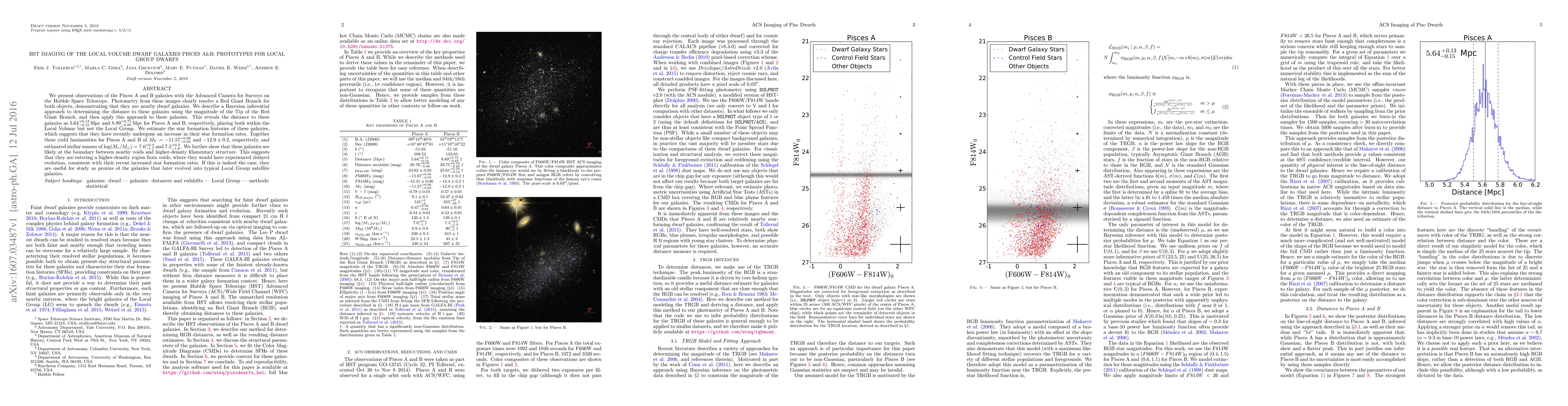 We present observations of the Pisces A and B galaxies with the Advanced Camera for Surveys on the Hubble Space Telescope. Photometry from these images clearly resolve a Red Giant Branch for both objects, demonstrating that they are nearby dwarf galaxies. We describe a Bayesian inferential approach to determining the distance to these galaxies using the magnitude of the tip of the RGB, and then apply this approach to these galaxies. We also provide the full probability distributions for parameters derived using this approach. This reveals the distance to these galaxies as $5.64^{+0.13}_{-0.15} \, {\rm Mpc}$ and $8.89^{+0.75}_{-0.85} \, {\rm Mpc}$ for Pisces A and B, respectively, placing both within the Local Volume but not the Local Group. We estimate the star formation histories of these galaxies, which suggests that they have recently undergone an increase in their star formation rates. Together these yield luminosities for Pisces A and B of $M_V=-11.57^{+0.06}_{-0.05}$ and $-12.9 \pm 0.2$, respectively, and estimated stellar masses of $\log(M_*/M_{\odot})= 7.0^{+0.4}_{-1.7}$ and $7.5^{+0.3}_{-1.8}$. We further show that these galaxies are likely at the boundary between nearby voids and higher-density filamentary structure. This suggests that they are entering a higher-density region from voids, where they would have experienced delayed evolution, consistent with their recent increased star formation rates. If this is indeed the case, they are useful for study as proxies of the galaxies that later evolved into typical Local Group satellite galaxies.