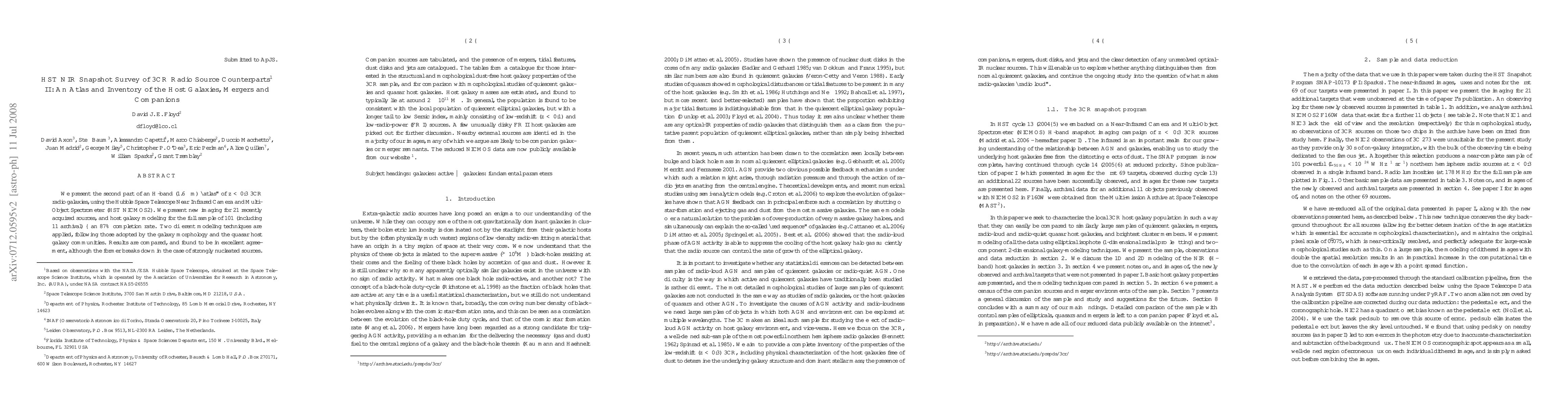 This paper presents an H-band atlas of 101 low-redshift 3CR radio galaxies using HST NICMOS2, detailing host galaxy modeling and structural features. The study finds host galaxies typically have masses around 2*10^11 solar masses and resemble local elliptical galaxies, with some notable disky FR II hosts and many nearby companions.