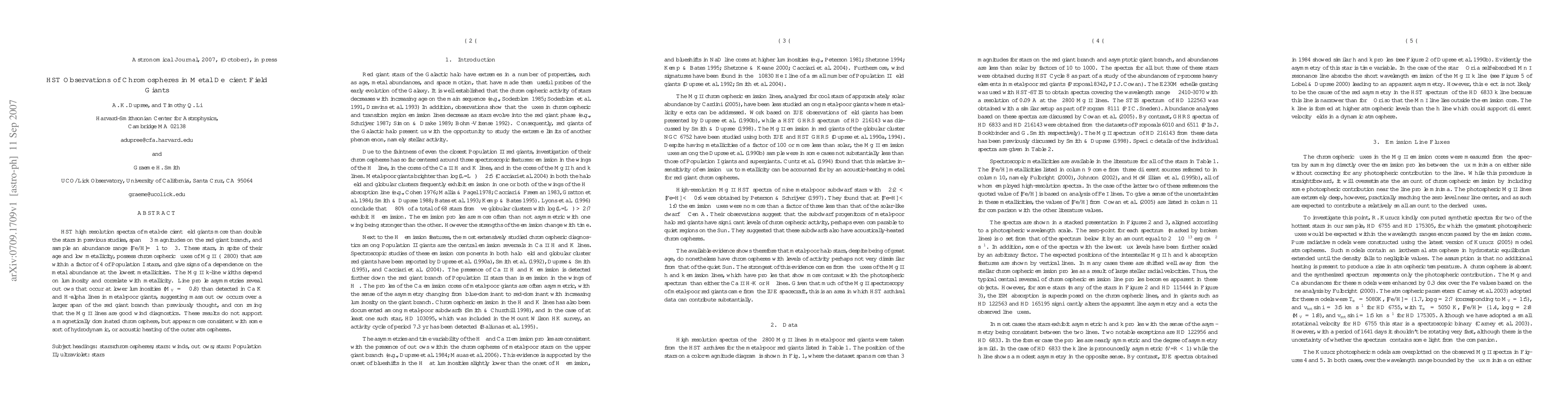 This study, using HST spectra, examines chromospheres in metal-deficient red giant stars, finding their Mg II fluxes comparable to Population I stars despite low metallicity. Chromospheric width and asymmetry suggest hydrodynamic heating rather than magnetic dominance, with mass outflow occurring across a broader range of the red giant branch.
