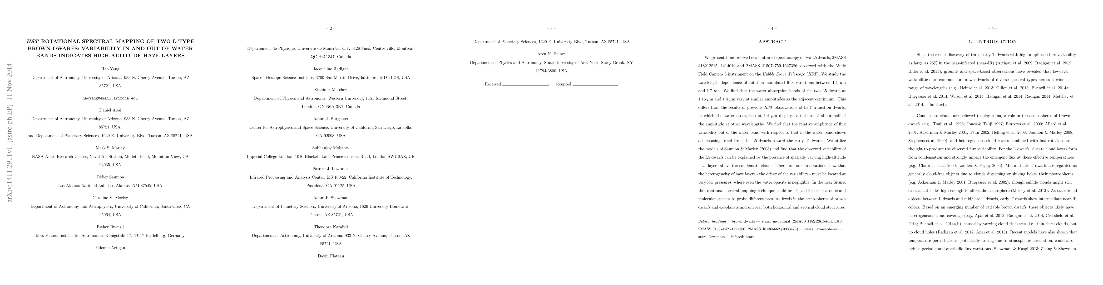 This study uses HST spectroscopy to analyze rotational flux variations in two L5 brown dwarfs, revealing high-altitude haze layers causing variability in water absorption bands. The findings suggest that haze heterogeneity at low pressures drives the observed spectral variability.