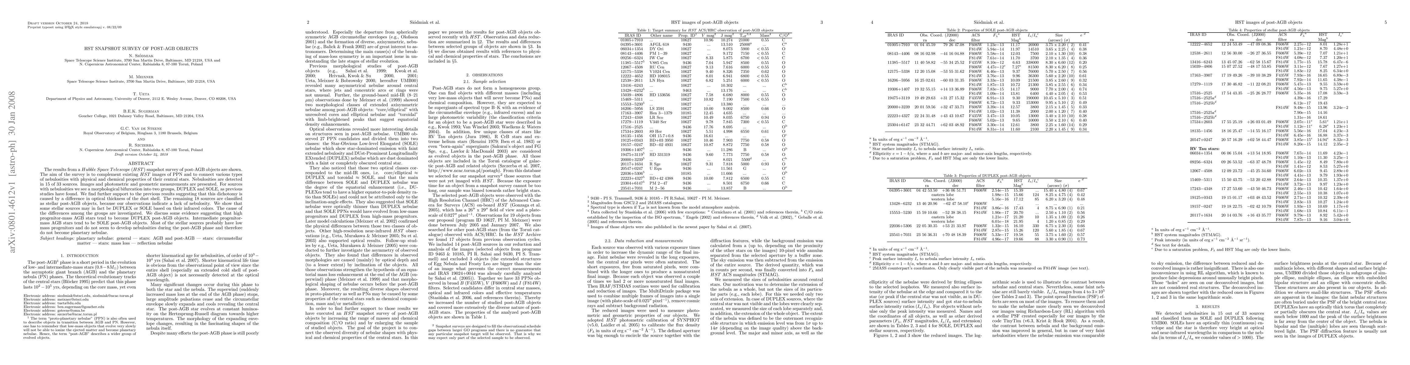 The HST snapshot survey of post-AGB objects reveals nebulosities in 15 of 33 sources, categorizing them into DUPLEX and SOLE types based on dust shell optical thickness. The remaining 18 sources are classified as stellar post-AGB objects without nebulosities, though some may exhibit DUPLEX or SOLE characteristics via infrared colors.