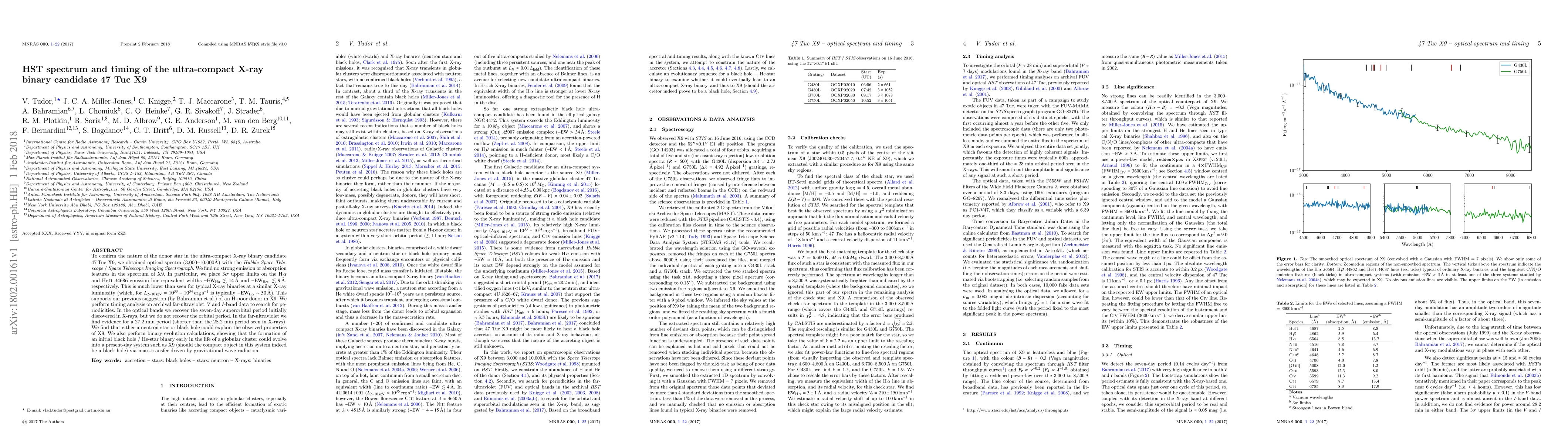 To confirm the nature of the donor star in the ultra-compact X-ray binary candidate 47 Tuc X9, we obtained optical spectra (3,000$-$10,000 {\AA}) with the Hubble Space Telescope / Space Telescope Imaging Spectrograph. We find no strong emission or absorption features in the spectrum of X9. In particular, we place $3\sigma$ upper limits on the H$\alpha$ and HeII $\lambda 4686$ emission line equivalent widths $-$EW$_{\mathrm{H\alpha}} \lesssim 14$ {\AA} and $-$EW$_{\mathrm{HeII}} \lesssim 9$ {\AA}, respectively. This is much lower than seen for typical X-ray binaries at a similar X-ray luminosity (which, for $L_{\mathrm{2-10 keV}} \approx 10^{33}-10^{34}$ erg s$^{-1}$ is typically $-$EW$_{\mathrm{H\alpha}} \sim 50$ {\AA}). This supports our previous suggestion (by Bahramian et al.) of an H-poor donor in X9. We perform timing analysis on archival far-ultraviolet, $V$ and $I$-band data to search for periodicities. In the optical bands we recover the seven-day superorbital period initially discovered in X-rays, but we do not recover the orbital period. In the far-ultraviolet we find evidence for a 27.2 min period (shorter than the 28.2 min period seen in X-rays). We find that either a neutron star or black hole could explain the observed properties of X9. We also perform binary evolution calculations, showing that the formation of an initial black hole / He-star binary early in the life of a globular cluster could evolve into a present-day system such as X9 (should the compact object in this system indeed be a black hole) via mass-transfer driven by gravitational wave radiation.