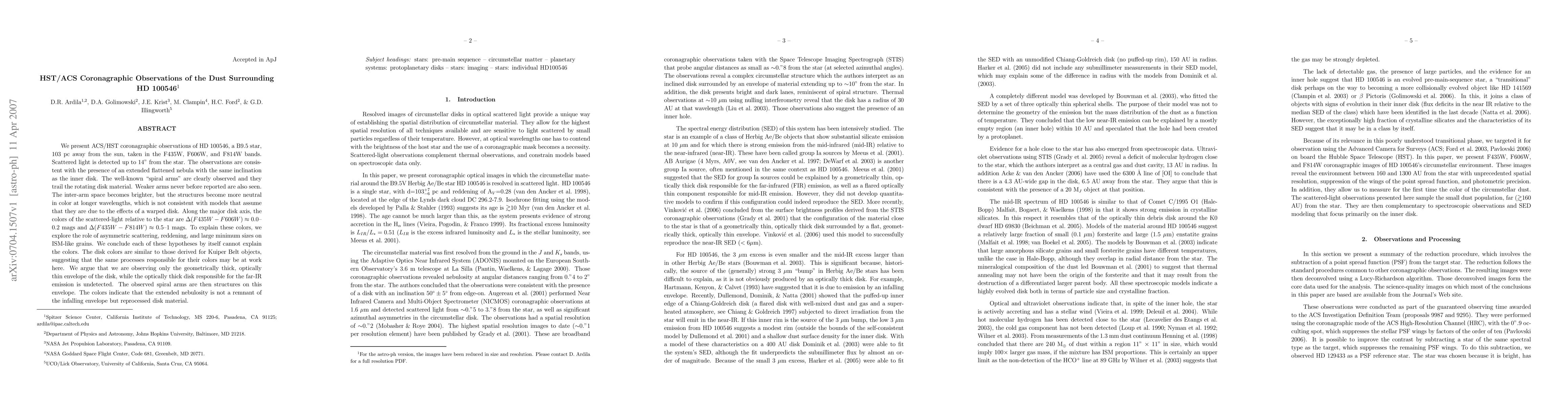 This paper reports on HST/ACS coronagraphic observations of the dust surrounding HD 100546, revealing an extended flattened nebula with spiral arms trailing the rotating disk material. The observed colors suggest that the extended nebulosity consists of reprocessed disk material rather than remnants of the infalling envelope.