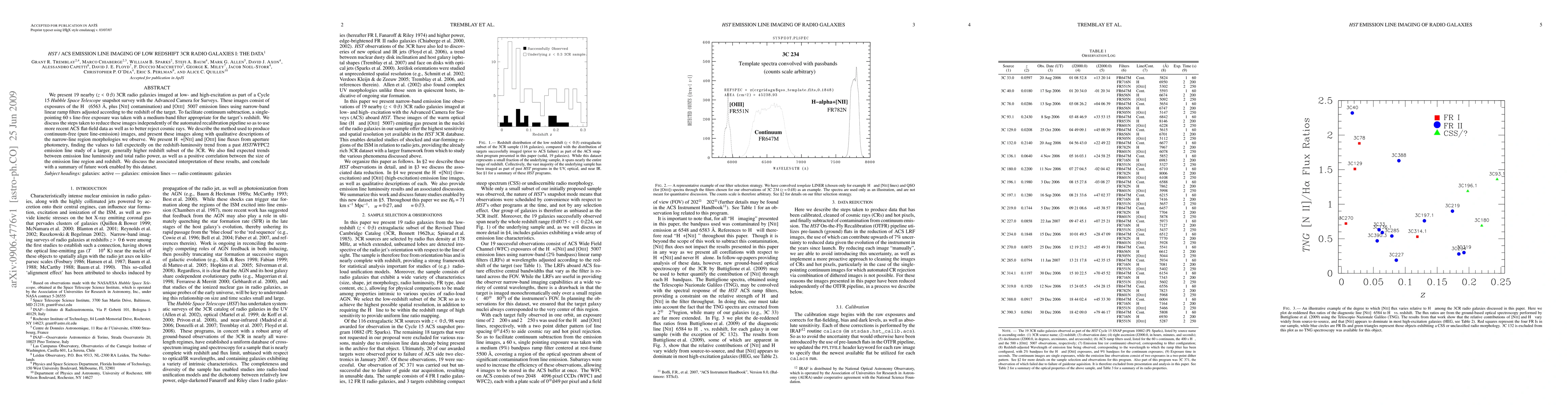 This paper presents HST/ACS imaging of 19 low redshift 3CR radio galaxies using narrow-band filters for H-alpha and [OIII] emission lines. The study details the reduction process and continuum subtraction methods, revealing expected trends between emission line luminosity and radio power, and correlating the size of the emission line region with redshift.