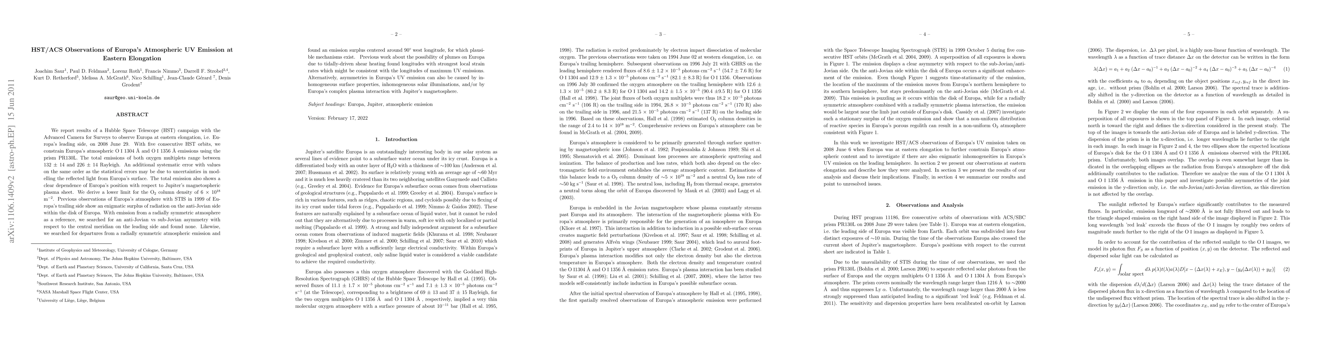 This study uses HST/ACS observations to measure Europa's atmospheric UV emissions at eastern elongation, finding emissions between 132 and 226 Rayleigh, and no significant asymmetry compared to previous trailing side observations. The study also identifies a possible emission surplus linked to tidal heating or surface properties.