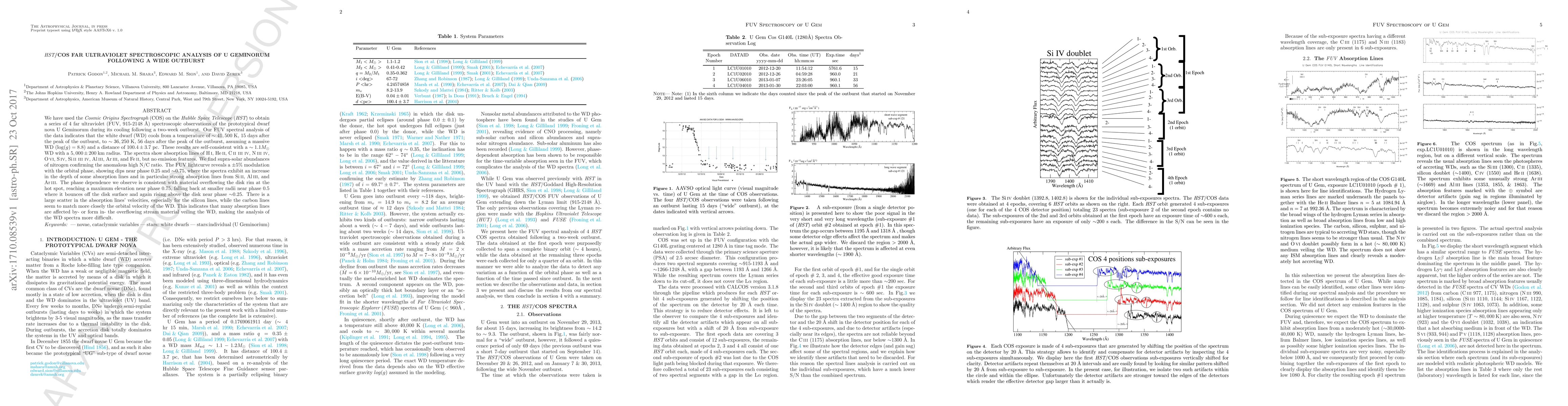 We have used HST/COS to obtain a series of 4 FUV (915-2148A) spectroscopic observations of the prototypical dwarf nova U Geminorum during its cooling following a two-week outburst. Our FUV spectral analysis of the data indicates that the white dwarf (WD) cools from a temperature of 41,500 K, 15 days after the peak of the outburst, to 36,250 K, 56 days after the peak of the outburst, assuming a massive WD (log(g)=8.8) and a distance of 100.4 pc. These results are self-consistent with a 1.1 solar mass WD with a 5,000 km radius. The spectra show many absorption lines of but no emission features. We find supra-solar abundances of nitrogen confirming the anomalous high N/C ratio. The FUV lightcurve reveals a 5% modulation with the orbital phase, showing dips near phase 0.25 and 0.75, where the spectra exhibit an increase in the depth of some absorption lines and in particular strong absorption lines from Si, Al, and Ar. The phase dependence we observe is consistent with material overflowing the disk rim at the hot spot, reaching a maximum elevation near phase 0.75, falling back at smaller radii near phase 0.5 where it bounces off the disk surface and again rising above the disk near phase 0.25. There is a large scatter in the absorption lines' velocities, especially for the silicon lines, while the carbon lines seem to match more closely the orbital velocity of the WD. This indicates that many absorption lines are affected by- or form in- the overflowing stream material veiling the WD, making the analysis of the WD spectra more difficult.
