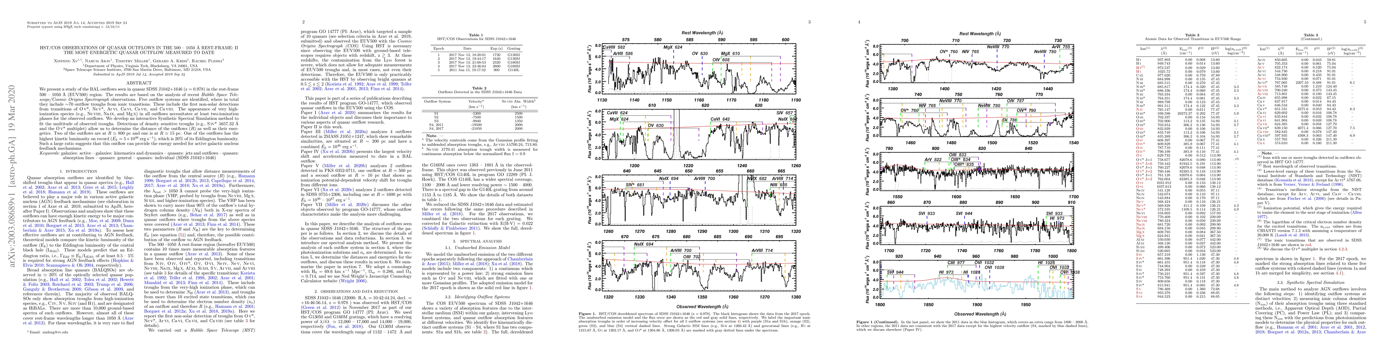 We present a study of the BAL outflows seen in quasar SDSS J1042+1646 (z = 0.978) in the rest-frame 500 -- 1050 $\r{A}$ (EUV500) region. The results are based on the analysis of recent Hubble Space Telescope/Cosmic Origins Spectrograph observations. Five outflow systems are identified, where in total they include $\sim$70 outflow troughs from ionic transitions. These include the first non-solar detections from transitions of O V*, Ne V*, Ar VI, Ca VI, Ca VII, and Ca VIII. The appearance of very high-ionization species (e.g., Ne VIII, Na IX, and Mg X) in all outflows necessitates at least two-ionization phases for the observed outflows. We develop an interactive Synthetic Spectral Simulation method to fit the multitude of observed troughs. Detections of density sensitive troughs (e.g., S IV* $\lambda$ 657.32 $\r{A}$ and the O V* multiplet) allow us to determine the distance of the outflows ($R$) as well as their energetics. Two of the outflows are at $R$ $\simeq$ 800 pc and one is at $R$ $\simeq$ 15 pc. One of the outflows has the highest kinetic luminosity on record ($\dot{E_{k}}$ $ = 5\times 10^{46}$ erg s$^{-1}$), which is 20% of its Eddington luminosity. Such a large ratio suggests that this outflow can provide the energy needed for active galactic nucleus feedback mechanisms.