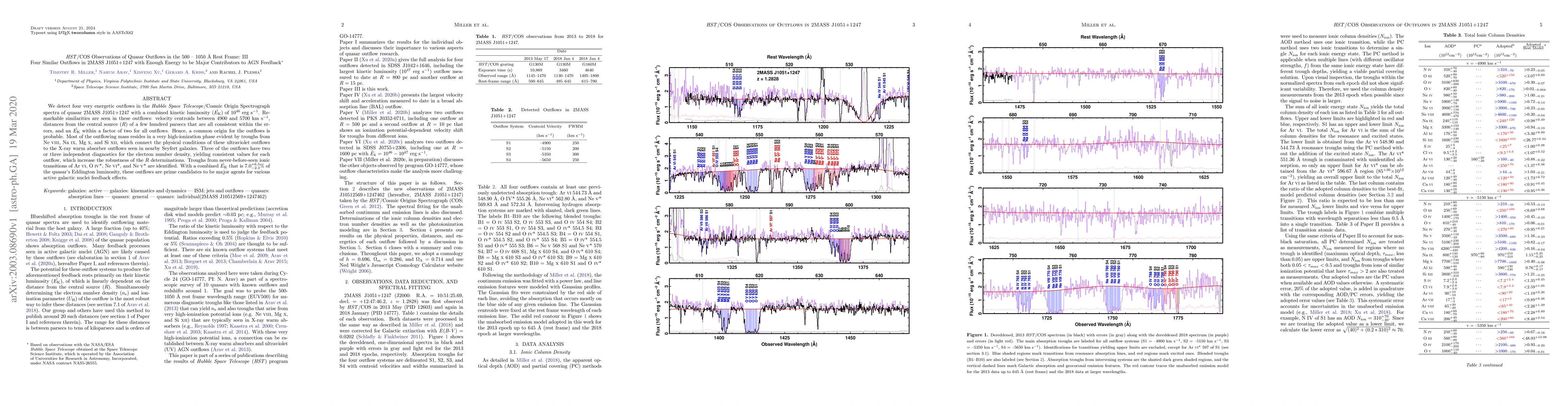 The paper presents HST/COS observations of four highly energetic outflows in quasar 2MASS J1051+1247, with a combined kinetic luminosity of 10^46 erg s^-1. These outflows share similar characteristics, such as velocity, distance from the central source, and energy output, suggesting a common origin. The high-ionization nature of these outflows connects them to X-ray warm absorber outflows in Seyfert galaxies. With electron number density diagnostics and identification of rare ionic transitions, these outflows are identified as significant contributors to AGN feedback effects.