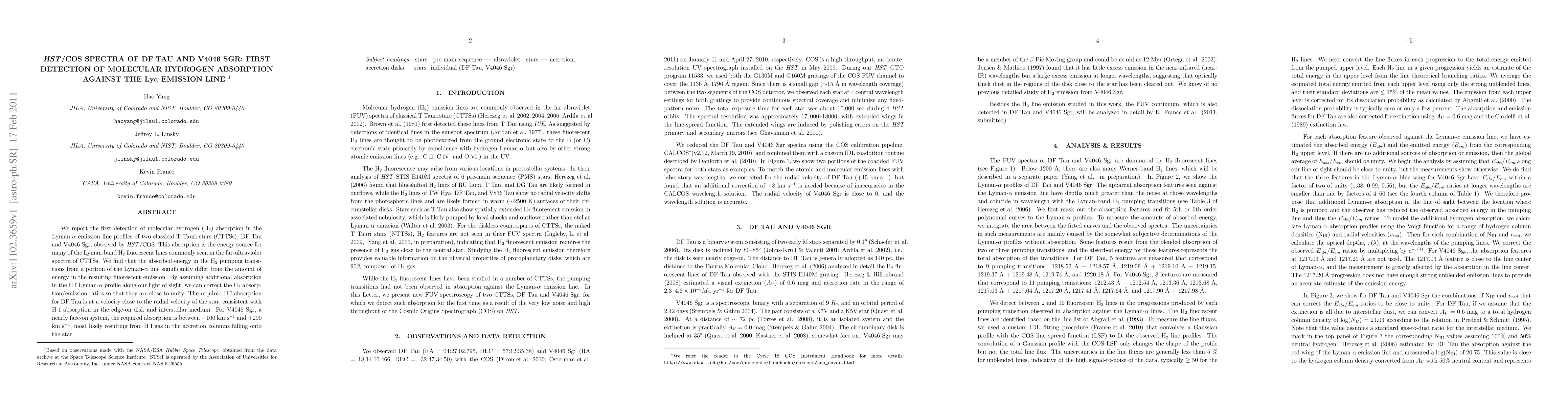 We report the first detection of molecular hydrogen (H$_{2}$) absorption in the Lyman-$\alpha$ emission line profiles of two classical T Tauri stars (CTTSs), DF Tau and V4046 Sgr, observed by \emph{HST}/COS. This absorption is the energy source for many of the Lyman-band H$_{2}$ fluorescent lines commonly seen in the far-ultraviolet spectra of CTTSs. We find that the absorbed energy in the H$_{2}$ pumping transitions from a portion of the Lyman-$\alpha$ line significantly differ from the amount of energy in the resulting fluorescent emission. By assuming additional absorption in the H I Lyman-$\alpha$ profile along our light of sight, we can correct the H$_{2}$ absorption/emission ratios so that they are close to unity. The required H I absorption for DF Tau is at a velocity close to the radial velocity of the star, consistent with H I absorption in the edge-on disk and interstellar medium. For V4046 Sgr, a nearly face-on system, the required absorption is between +100 km/s and +290 km/s, most likely resulting from H I gas in the accretion columns falling onto the star.