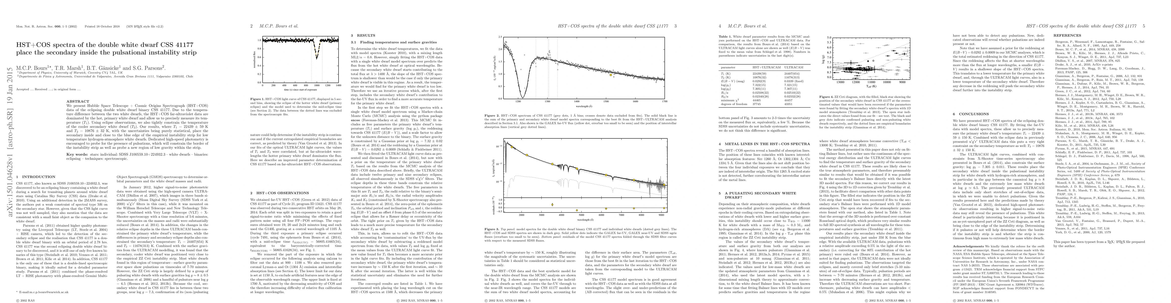 This paper utilizes HST+COS spectra to measure the temperatures of the two white dwarfs in the binary CSS 41177, finding that the cooler secondary lies within the pulsational instability strip. Further high-speed photometry is recommended to detect pulsations and explore the strip's boundaries.