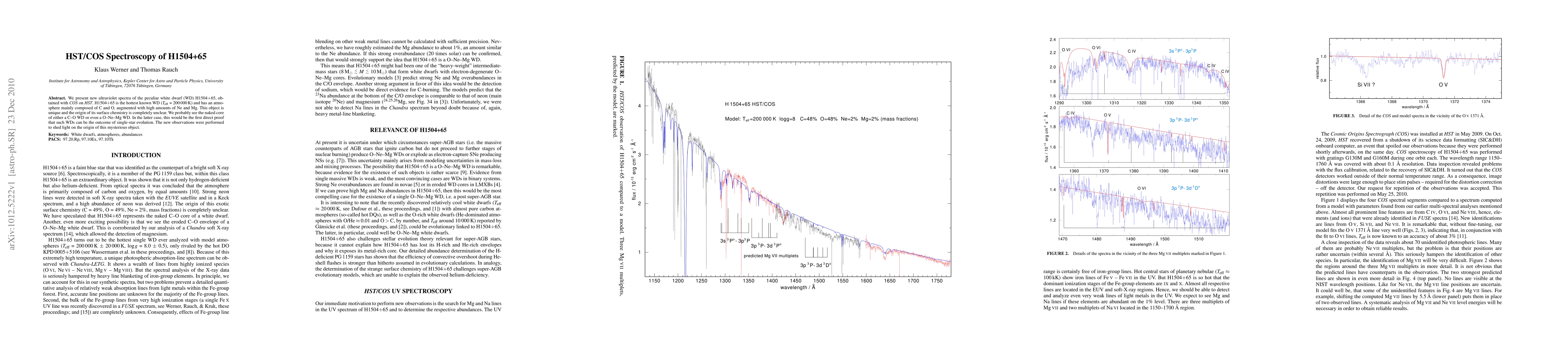 We present new ultraviolet spectra of the peculiar white dwarf (WD) H1504+65, obtained with COS on HST. H1504+65 is the hottest known WD (Teff= 200,000 K) and has an atmosphere mainly composed of C and O, augmented with high amounts of Ne and Mg. This object is unique and the origin of its surface chemistry is completely unclear. We probably see the naked core of either a C--O WD or even a O--Ne--Mg WD. In the latter case, this would be the first direct proof that such WDs can be the outcome of single-star evolution. The new observations were performed to shed light on the origin of this mysterious object.