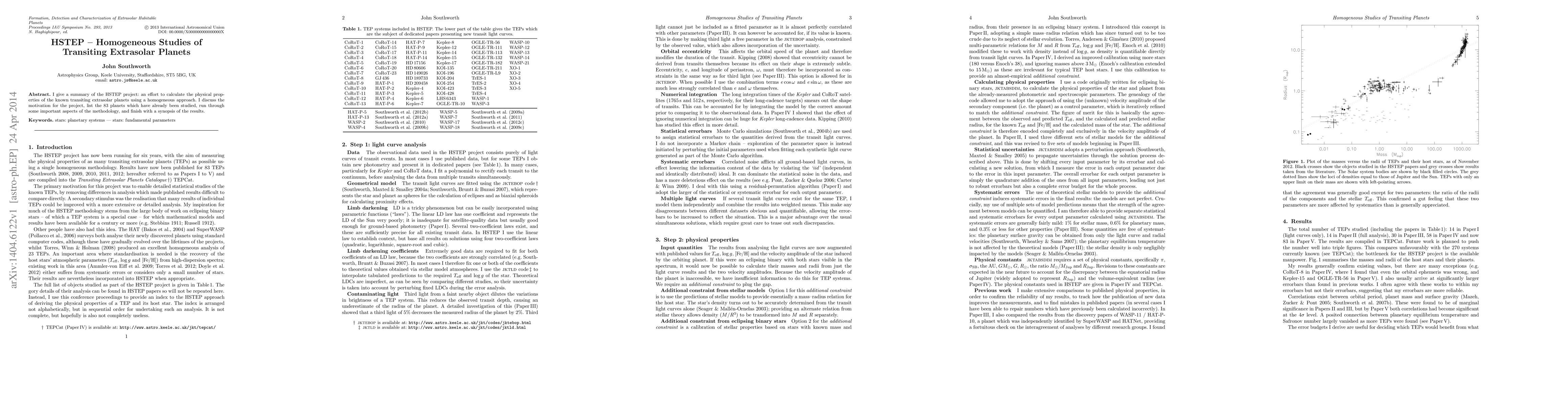 The HSTEP project aims to determine the physical properties of known transiting extrasolar planets using a consistent methodology. The project has analyzed 83 planets, compiling results into an online catalogue called TEPCat.