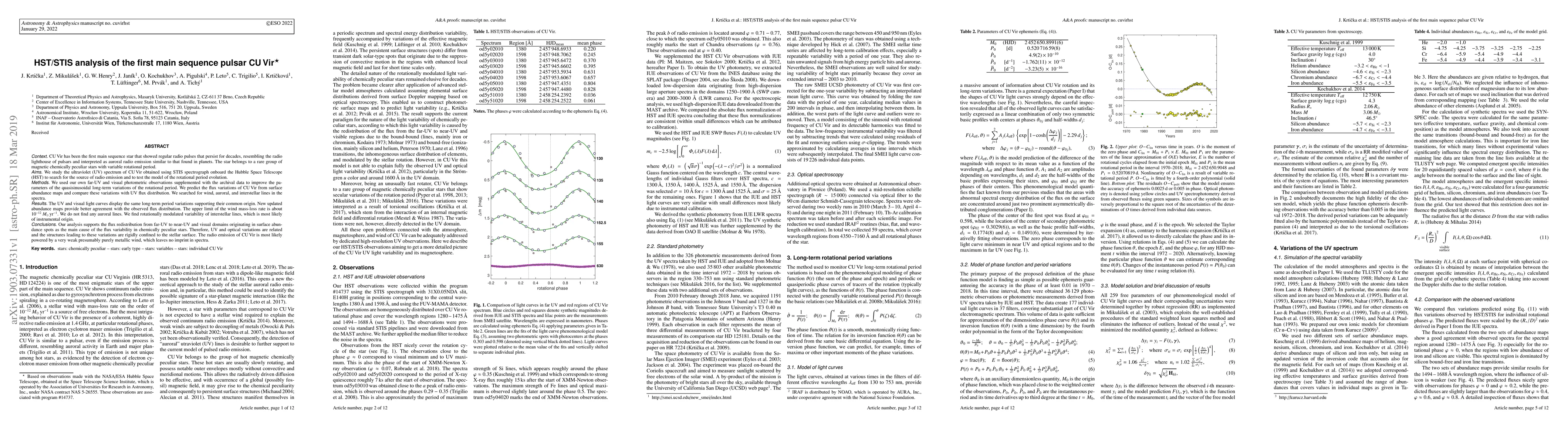 CU Vir has been the first main sequence star that showed regular radio pulses that persist for decades, resembling the radio lighthouse of pulsars and interpreted as auroral radio emission similar to that found in planets. The star belongs to a rare group of magnetic chemically peculiar stars with variable rotational period. We study the ultraviolet (UV) spectrum of CU Vir obtained using STIS spectrograph onboard the Hubble Space Telescope (HST) to search for the source of radio emission and to test the model of the rotational period evolution. We used our own far-UV and visual photometric observations supplemented with the archival data to improve the parameters of the quasisinusoidal long-term variations of the rotational period. We predict the flux variations of CU Vir from surface abundance maps and compare these variations with UV flux distribution. We searched for wind, auroral, and interstellar lines in the spectra. The UV and visual light curves display the same long-term period variations supporting their common origin. New updated abundance maps provide better agreement with the observed flux distribution. The upper limit of the wind mass-loss rate is about $10^{-12}\,M_\odot\,\rm{yr}^{-1}$. We do not find any auroral lines. We find rotationally modulated variability of interstellar lines, which is most likely of instrumental origin. Our analysis supports the flux redistribution from far-UV to near-UV and visual domains originating in surface abundance spots as the main cause of the flux variability in chemically peculiar stars. Therefore, UV and optical variations are related and the structures leading to these variations are rigidly confined to the stellar surface. The radio emission of CU Vir is most likely powered by a very weak presumably purely metallic wind, which leaves no imprint in spectra.