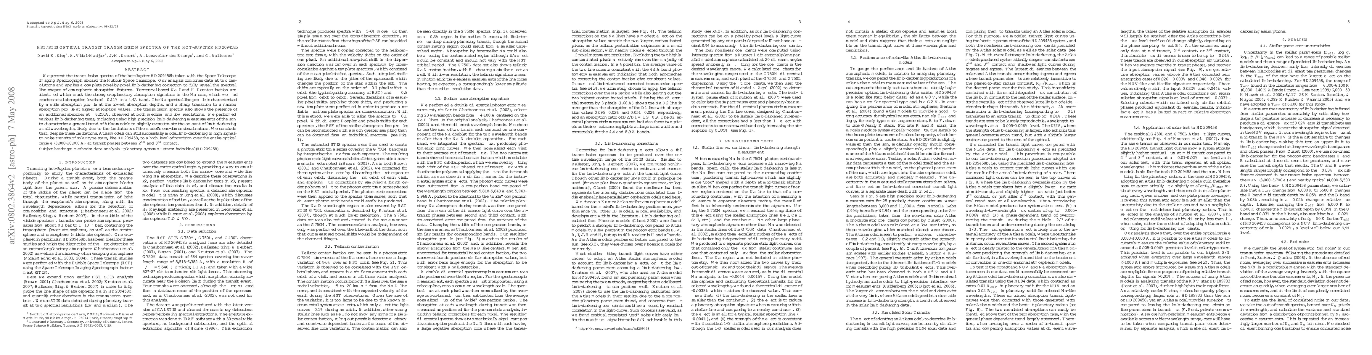 This study presents detailed optical transit transmission spectra of HD209458b, a hot Jupiter, revealing strong exoplanetary absorption signatures despite contamination from terrestrial-based Na I and H I features. The analysis uses high-resolution data and models limb-darkening with high precision, concluding that these models can accurately model transits in solar-type stars.