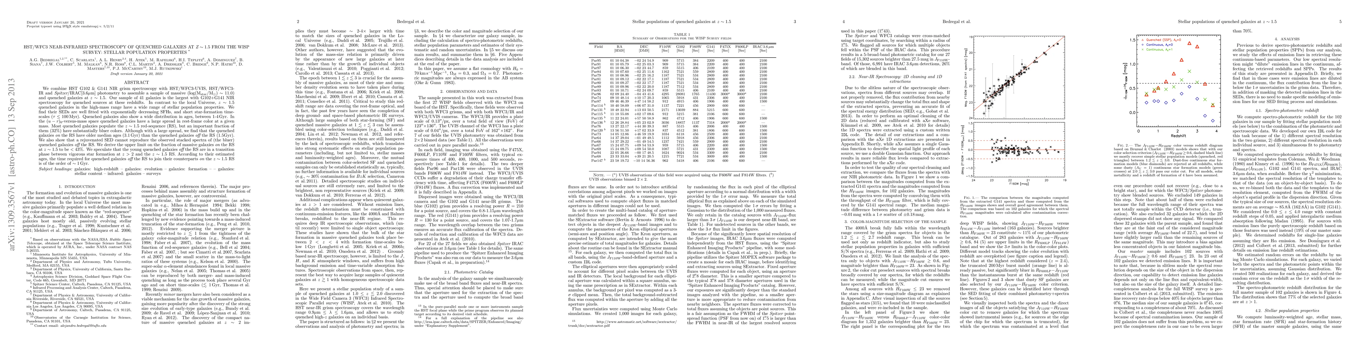 This study uses HST and Spitzer data to analyze the stellar population properties of massive, quenched galaxies at z~1.5, finding a wide range of ages and star-formation histories, with most galaxies on the red sequence but a significant fraction transitioning from vigorous star formation.