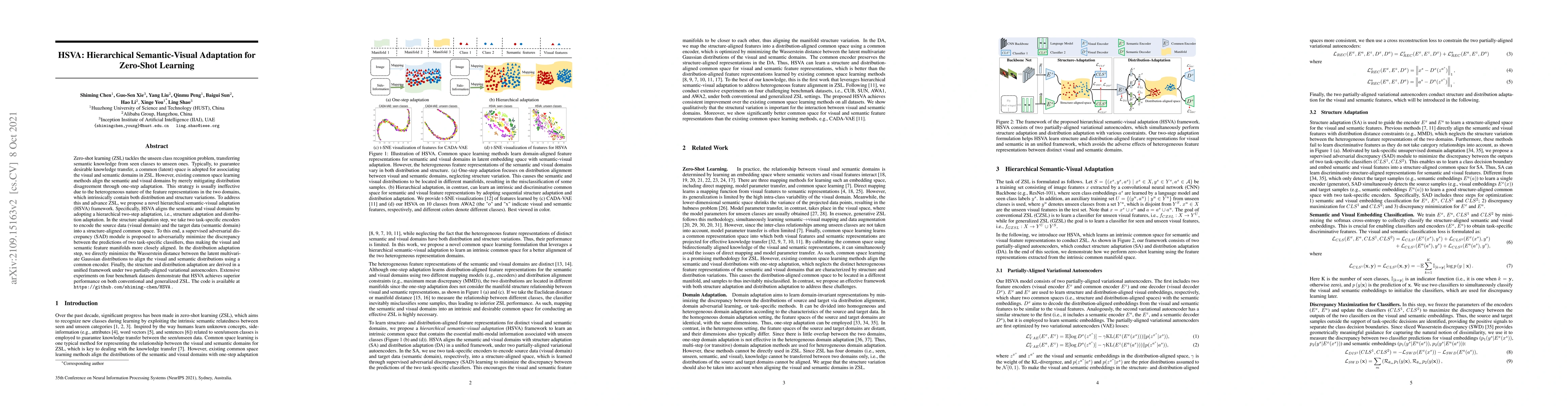 The paper proposes a hierarchical semantic-visual adaptation (HSVA) framework for zero-shot learning, addressing the limitations of existing methods by employing a two-step adaptation process: structure adaptation and distribution adaptation. This approach achieves superior performance on benchmark datasets for both conventional and generalized zero-shot learning.