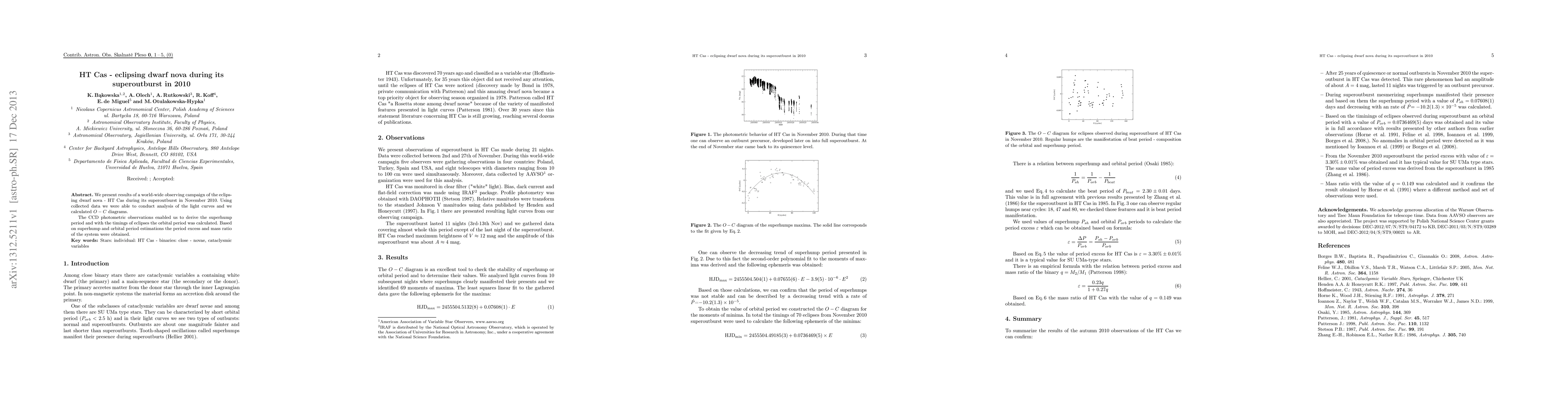 We present results of a world-wide observing campaign of the eclipsing dwarf nova - HT Cas during its superoutburst in November 2010. Using collected data we were able to conduct analysis of the light curves and we calculated $O-C$ diagrams. The CCD photometric observations enabled us to derive the superhump period and with the timings of eclipses the orbital period was calculated. Based on superhump and orbital period estimations the period excess and mass ratio of the system were obtained.