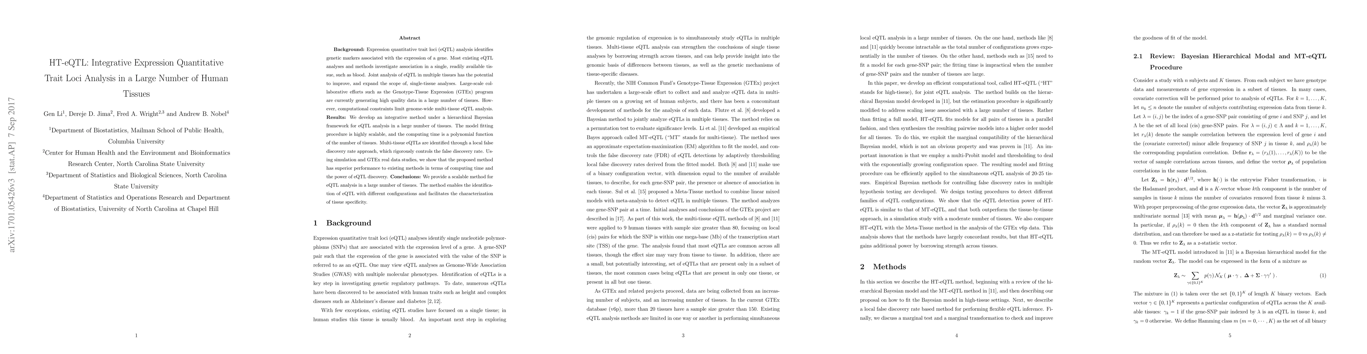This paper introduces HT-eQTL, an integrative method for genome-wide expression quantitative trait loci (eQTL) analysis across multiple tissues using a hierarchical Bayesian framework. The proposed method is scalable and outperforms existing techniques in terms of computational efficiency and eQTL discovery power.