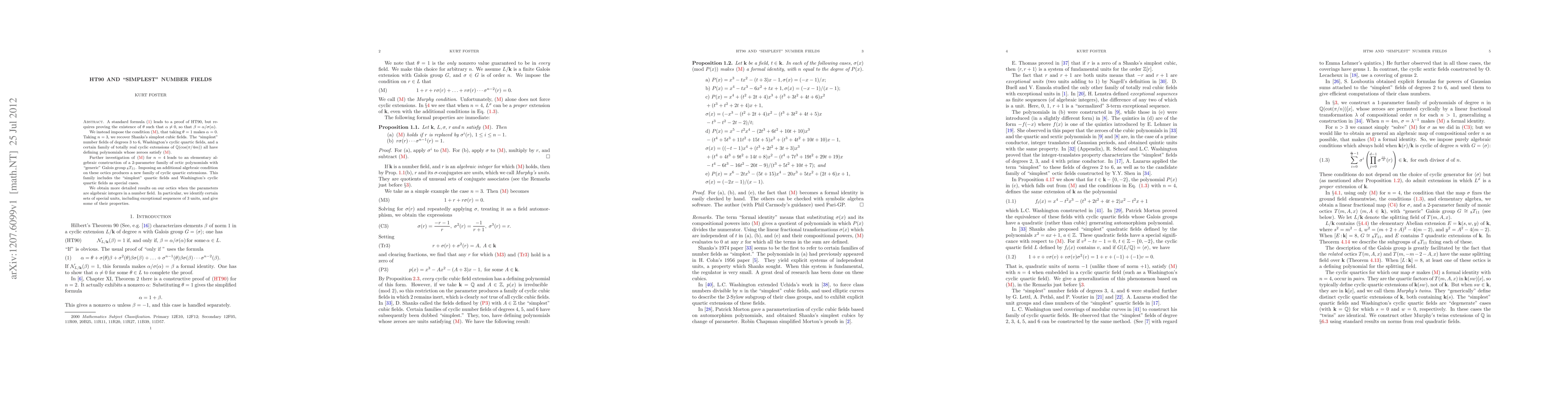 A standard formula (1) leads to a proof of HT90, but requires proving the existence of $\theta$ such that $\alpha\ne 0$, so that $\beta=\alpha/\sigma(\alpha)$. We instead impose the condition (M), that taking $\theta=1$ makes $\alpha=0$. Taking $n=3$, we recover Shanks's simplest cubic fields. The "simplest" number fields of degrees 3 to 6, Washington's cyclic quartic fields, and a certain family of totally real cyclic extensions of $\Q(\cos(\pi/4m))$ all have defining polynomials whose zeroes satisfy \eqref{e:M}. Further investigation of (M) for $n=4$ leads to an elementary algebraic construction of a 2-parameter family of octic polynomials with "generic" Galois group $_{8}T_{11}$. Imposing an additional algebraic condition on these octics produces a new family of cyclic quartic extensions. This family includes the "simplest" quartic fields and Washington's cyclic quartic fields as special cases. We obtain more detailed results on our octics when the parameters are algebraic integers in a number field. In particular, we identify certain sets of special units, including exceptional sequences of 3 units, and give some of their properties.
