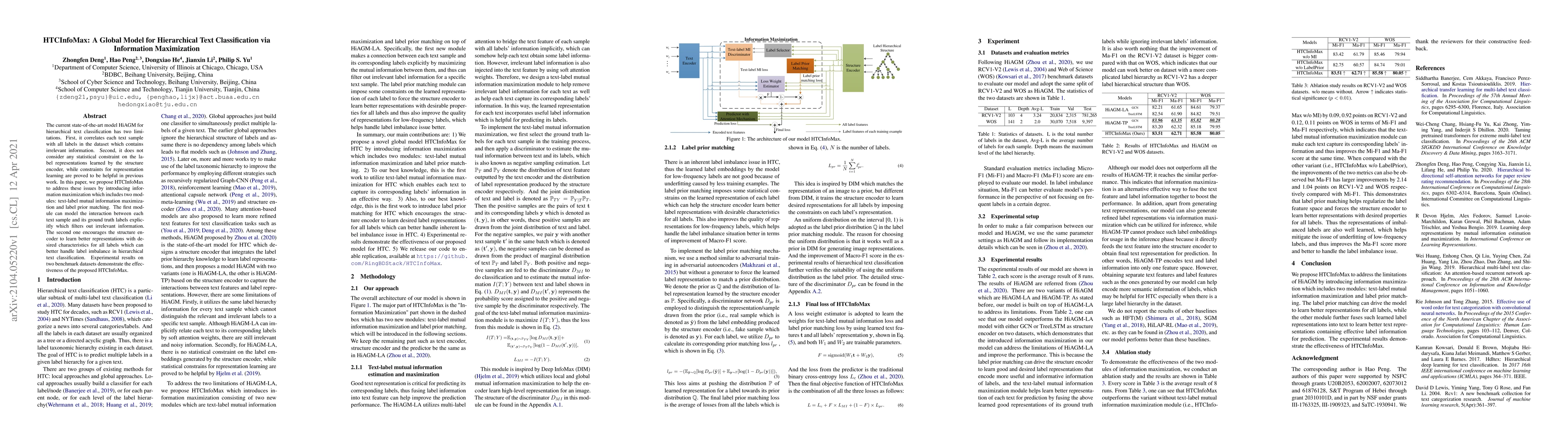 HTCInfoMax proposes a novel hierarchical text classification model addressing the limitations of the HiAGM model by incorporating information maximization, including text-label mutual information maximization and label prior matching, to filter out irrelevant information and improve label representation learning. Experimental results show its effectiveness on benchmark datasets.