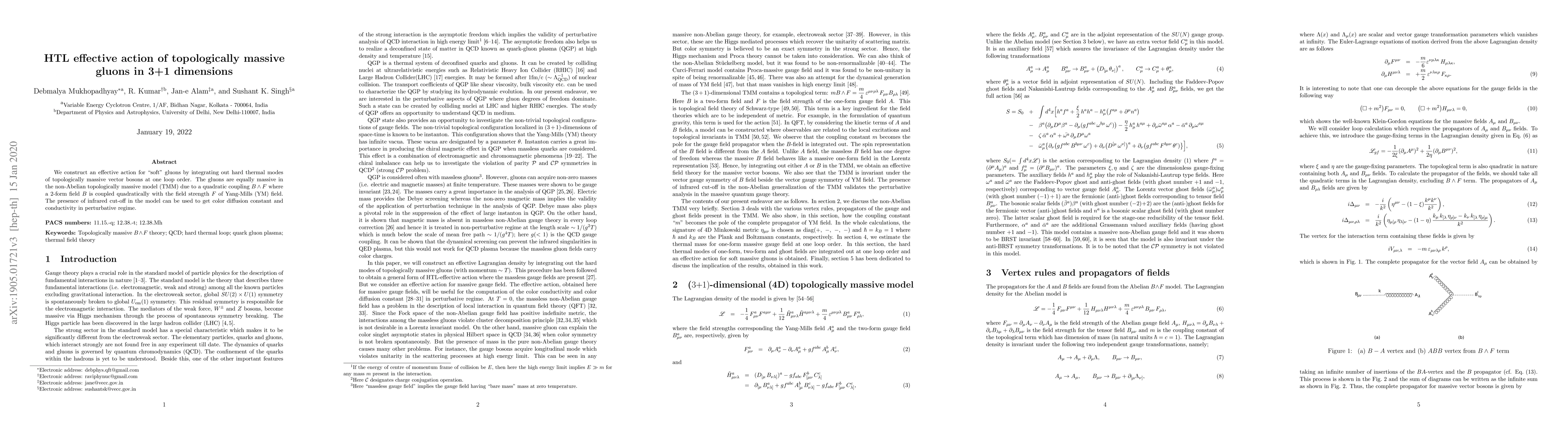 We construct an effective action for "soft" gluons by integrating out hard thermal modes of topologically massive vector bosons at one loop order. The loop carrying hard gluons (momentum $\sim T$) are known as hard thermal loop (HTL). The gluons are massive in the non-Abelian topologically massive model (TMM) due to a quadratic coupling $B\wedge F$ where a 2-form field $B$ is coupled quadratically with the field strength $F$ of Yang-Mills (YM) field. The mass of the gluons plays an important role in the perturbative analysis of thermal field theory. Due to the presence of this infrared cut-off in the model, the color diffusion constant and conductivity can be analyzed in perturbative regime.