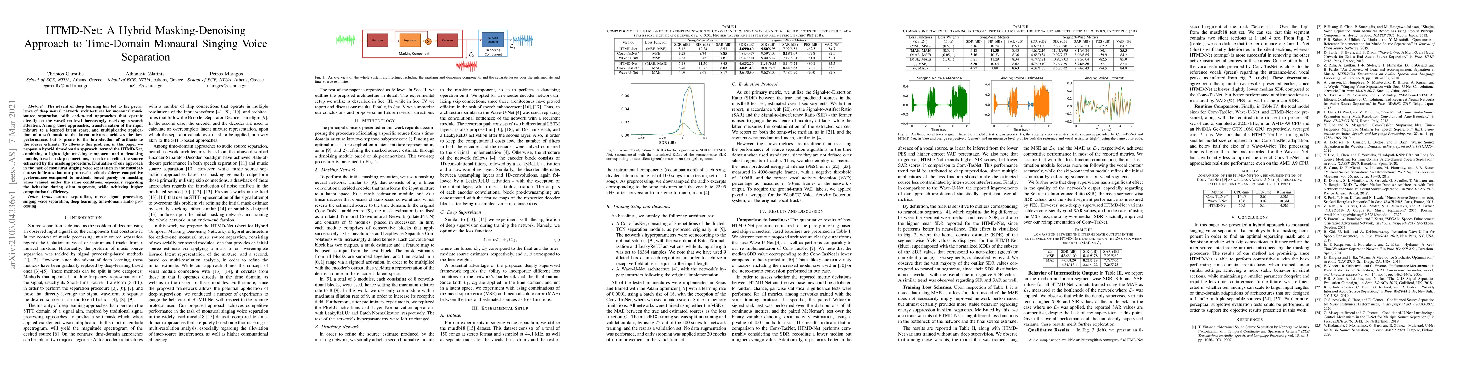 HTMD-Net combines a lightweight masking component with a denoising module to refine monaural singing voice separation, achieving competitive performance and higher computational efficiency compared to purely masking-based methods. The approach demonstrates improved handling of silent segments in the musdb18 dataset.