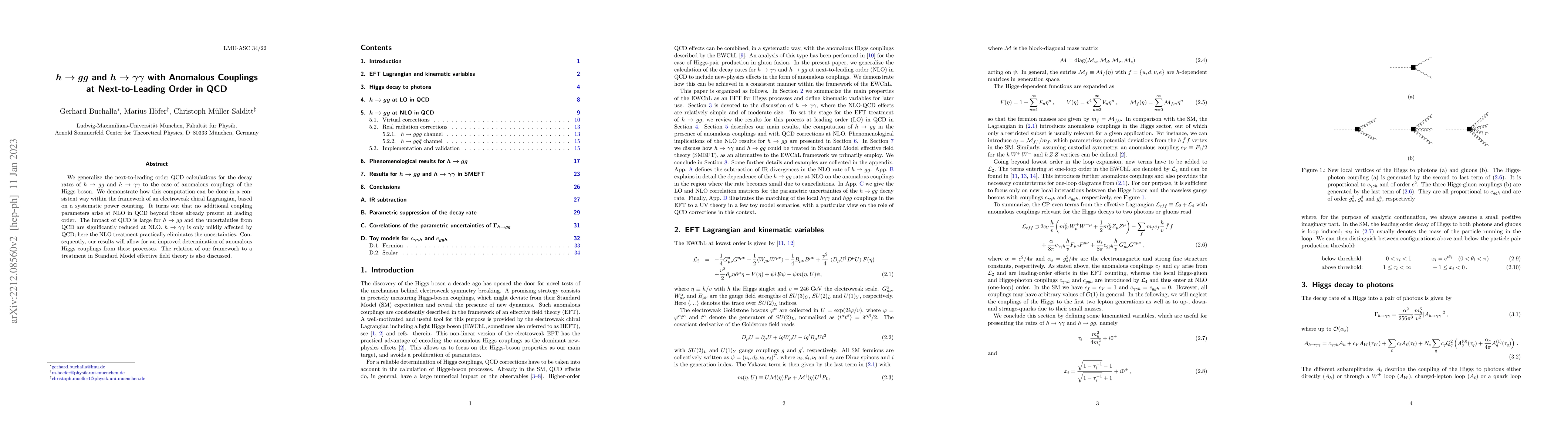 We generalize the next-to-leading order QCD calculations for the decay rates of $h\to gg$ and $h\to\gamma\gamma$ to the case of anomalous couplings of the Higgs boson. We demonstrate how this computation can be done in a consistent way within the framework of an electroweak chiral Lagrangian, based on a systematic power counting. It turns out that no additional coupling parameters arise at NLO in QCD beyond those already present at leading order. The impact of QCD is large for $h\to gg$ and the uncertainties from QCD are significantly reduced at NLO. $h\to\gamma\gamma$ is only mildly affected by QCD; here the NLO treatment practically eliminates the uncertainties. Consequently, our results will allow for an improved determination of anomalous Higgs couplings from these processes. The relation of our framework to a treatment in Standard Model effective field theory is also discussed.