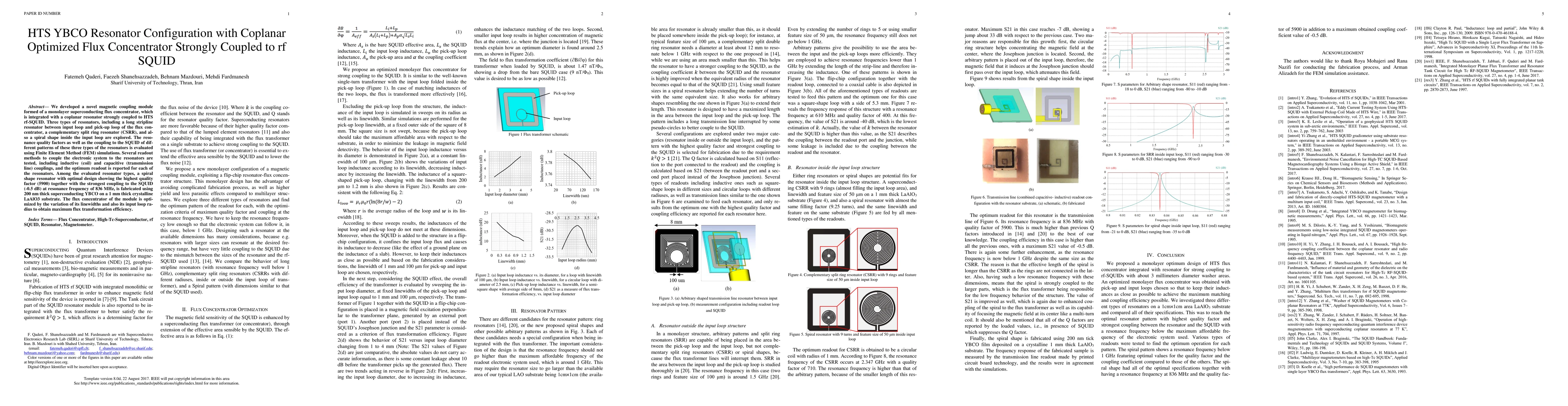 We developed a novel magnetic coupling module formed of a monolayer superconducting flux concentrator, which is integrated with a coplanar resonator strongly coupled to HTS rf-SQUID. Three types of resonators, including a long stripline resonator between input loop and pick-up loop of the flux concentrator, a complementary split ring resonator (CSRR), and also a spiral shape inside the input loop are explored. The resonance quality factors as well as the coupling to the SQUID of different patterns of these three types of the resonators is evaluated using Finite Element Method (FEM) simulations. Several readout methods to couple the electronic system to the resonators are tested, including inductive (coil) and capacitive (transmission line) couplings, and the optimum readout is reported for each of the resonators. Among the evaluated resonator types, a spiral shape resonator with optimal design showing the highest quality factor (5900) together with the strongest coupling to the SQUID (-0.5 dB) at resonance frequency of 836 MHz, is fabricated using 200 nm thick superconducting YBCO on a 1 mm thick crystalline LaAlO3 substrate. The flux concentrator of the module is optimized by the variation of its linewidths and also its input loop radius to obtain maximum flux transformation efficiency.