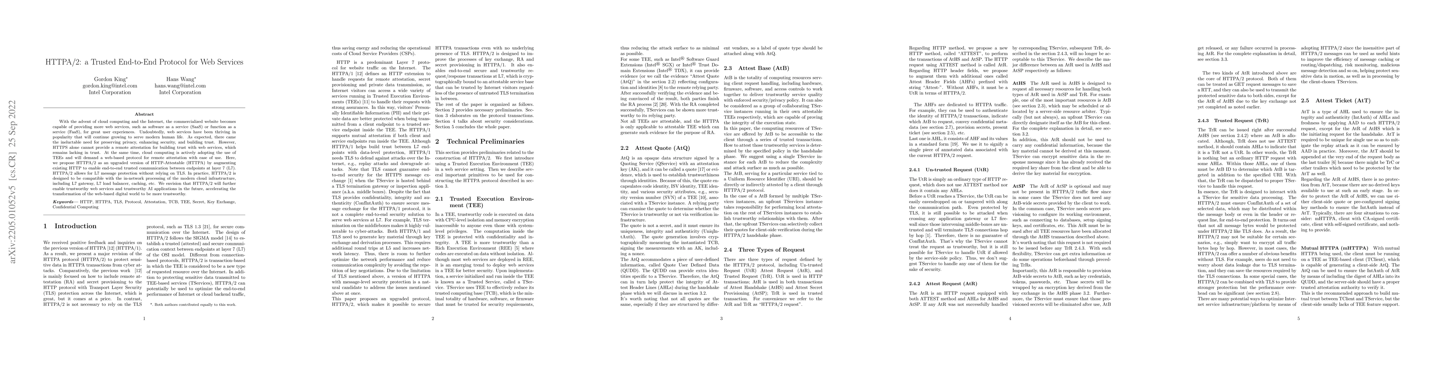 This paper proposes HTTPA/2, an upgraded version of HTTPA, to provide end-to-end trusted communication for web services without relying on TLS, addressing the need for remote attestation in cloud computing environments. It aims to enhance privacy, security, and trust in web services and AI applications.