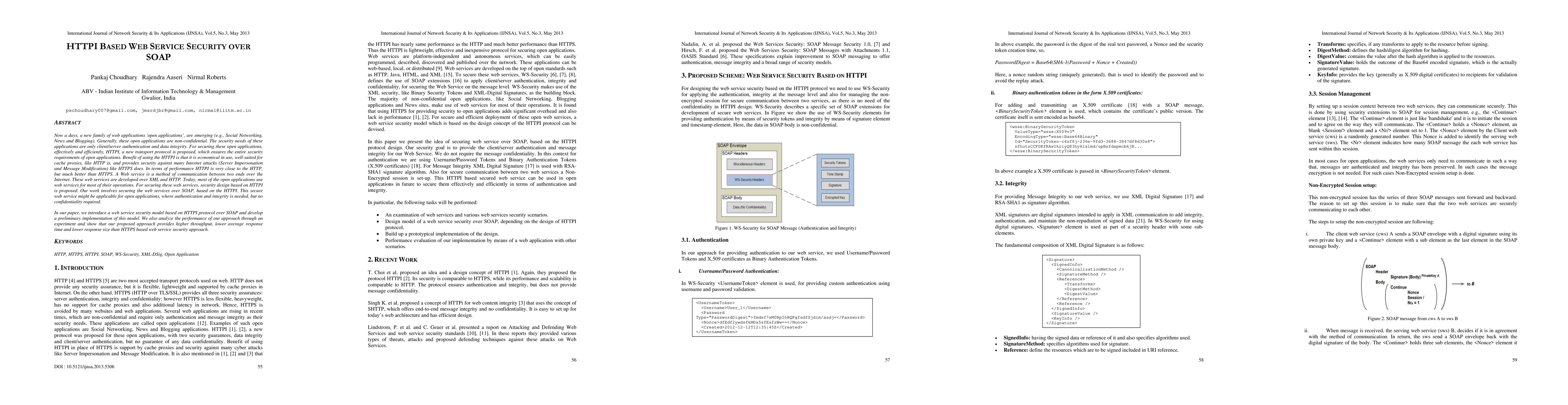 This paper proposes a web service security model using the HTTPI protocol over SOAP to secure open applications requiring client/server authentication and data integrity, but not confidentiality. The proposed model demonstrates higher throughput, lower response time, and smaller response size compared to HTTPS-based security.