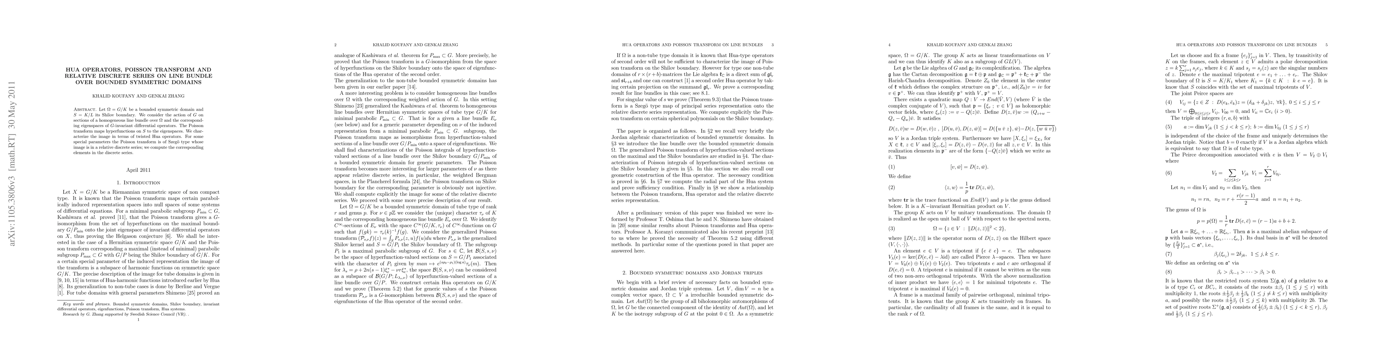This paper explores how the Poisson transform maps hyperfunctions on the boundary of a bounded symmetric domain to eigenspaces of G-invariant differential operators, relating it to twisted Hua operators and the relative discrete series.