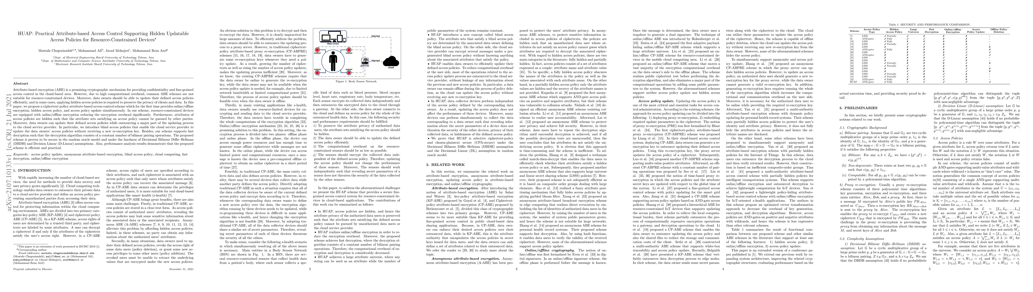 This paper proposes a novel ciphertext-policy attribute-based access control scheme for resource-constrained devices, featuring online/offline encryption, hidden access policies, and efficient policy updates. The scheme ensures security under DBDH and D-Linear assumptions and demonstrates practical efficiency.