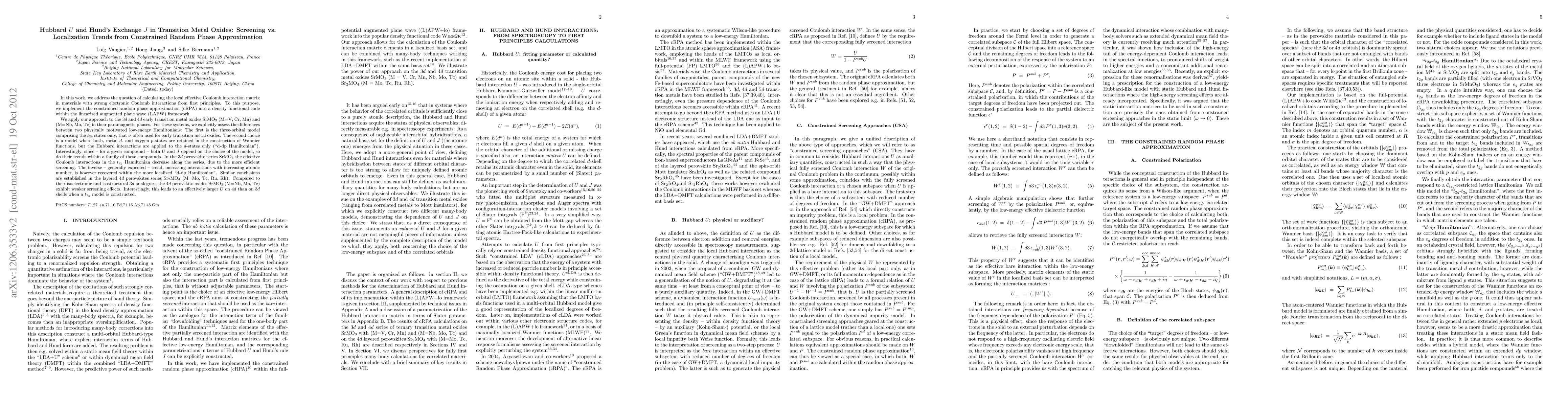 In this work, we address the question of calculating the local effective Coulomb interaction matrix in materials with strong electronic Coulomb interactions from first principles. To this purpose, we implement the constrained random phase approximation (cRPA) into a density functional code within the linearized augmented plane wave (LAPW) framework. We apply our approach to the 3d and 4d early transition metal oxides SrMO3 (M=V, Cr, Mn) and (M=Nb, Mo, Tc) in their paramagnetic phases. For these systems, we explicitly assess the differences between two physically motivated low-energy Hamiltonians: The first is the three-orbital model comprising the t2g states only, that is often used for early transition metal oxides. The second choice is a model where both, metal d- and oxygen p-states are retained in the construction of Wannier functions, but the Hubbard interactions are applied to the d-states only ("d-dp Hamiltonian"). Interestingly, since -- for a given compound -- both U and J depend on the choice of the model, so do their trends within a family of these compounds. In the 3d perovskite series SrMO3 the effective Coulomb interactions in the t2g Hamiltonian decrease along the series, due to the more efficient screening. The inverse -- generally expected -- trend, increasing interactions with increasing atomic number, is however recovered within the more localized "d-dp Hamiltonian". Similar conclusions are established in the layered 4d perovskites series Sr2MO4 (M=Mo, Tc, Ru, Rh). Compared to their isoelectronic and isostructural 3d analogues, the 4d 113 perovskite oxides SrMO3 (M=Nb, Mo, Tc) exhibit weaker screening effects. Interestingly, this leads to an effectively larger U on 4d shells than on 3d when a t2g model is constructed.