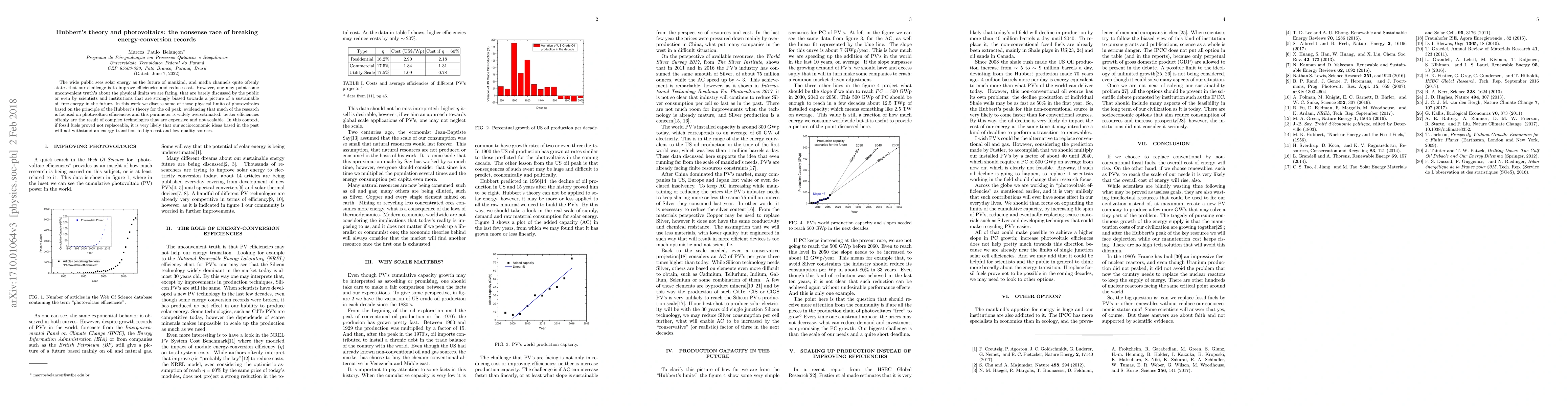 The wide public sees solar energy as the future of mankind, and media channels quite oftenly states that our challenge is to improve efficiencies and reduce cost. However, one may point some unconvenient truth's about the physical limits we are facing, that are barely discussed by the public or even by scientists and institutions that are strongly biased towards a picture of a sustainable oil free energy in the future. In this work we discuss some of those physical limits of photovoltaics based on the principle of the Hubbert's theory for the oil peak, evidencing that much of the research is focused on photovoltaic efficiencies and this parameter is widely overestimated: better efficiencies oftenly are the result of complex technologies that are expensive and not scalable. In this context, if fossil fuels proved not replaceable, it is very likely that our socioeconomic ideas based in the past will not withstand an energy transition to high cost and low quality sources.