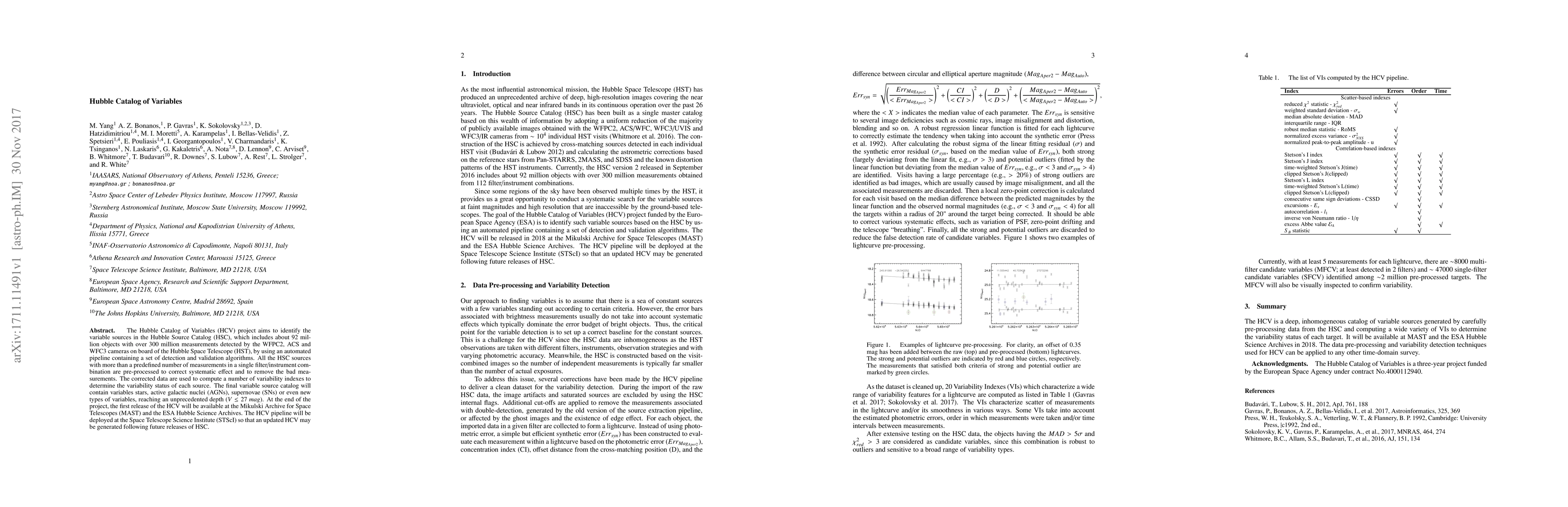 The Hubble Catalog of Variables (HCV) project aims to identify the variable sources in the Hubble Source Catalog (HSC), which includes about 92 million objects with over 300 million measurements detected by the WFPC2, ACS and WFC3 cameras on board of the Hubble Space Telescope (HST), by using an automated pipeline containing a set of detection and validation algorithms. All the HSC sources with more than a predefined number of measurements in a single filter/instrument combination are pre-processed to correct systematic effect and to remove the bad measurements. The corrected data are used to compute a number of variability indexes to determine the variability status of each source. The final variable source catalog will contain variables stars, active galactic nuclei (AGNs), supernovae (SNs) or even new types of variables, reaching an unprecedented depth (V$\leq$27 mag). At the end of the project, the first release of the HCV will be available at the Mikulski Archive for Space Telescopes (MAST) and the ESA Hubble Science Archives. The HCV pipeline will be deployed at the Space Telescope Science Institute (STScI) so that an updated HCV may be generated following future releases of HSC.