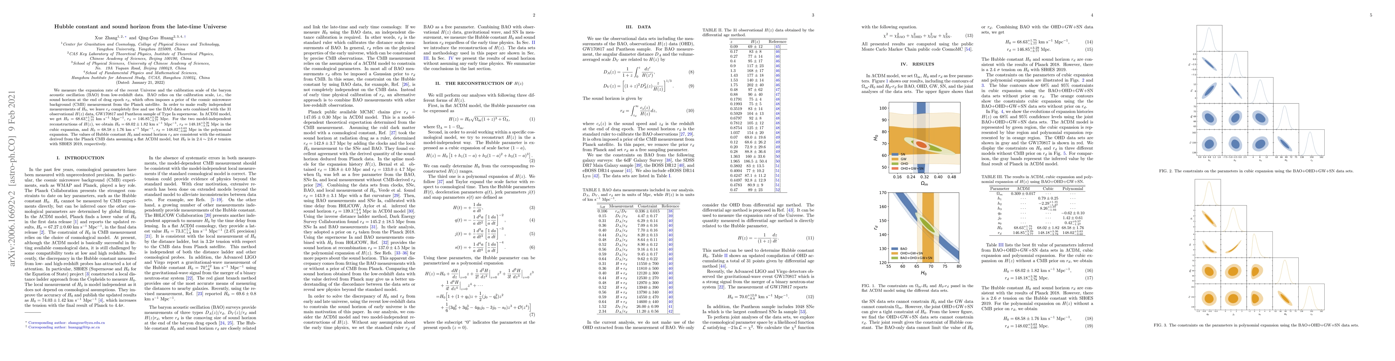 This paper measures the Hubble constant $H_0$ and sound horizon $r_d$ from low-redshift data, leaving $r_d$ free without relying on CMB priors. Results show $H_0=68.63^{+1.75}_{-1.77}$ km s$^{-1}$ Mpc$^{-1}$, consistent with $\Lambda$CDM model but in tension with SH0ES 2019 measurements.