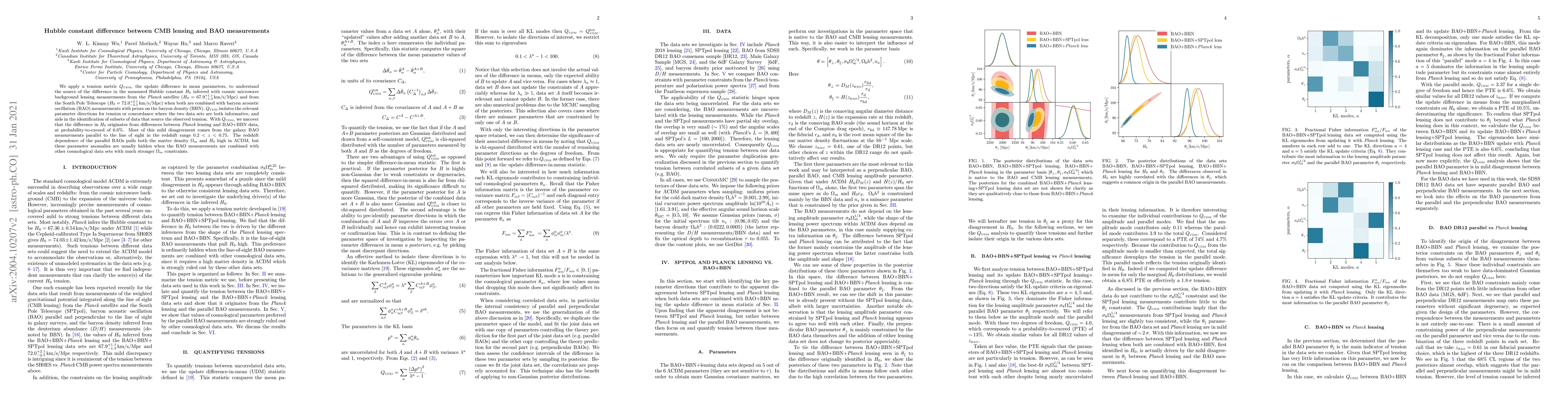 This paper investigates the discrepancy in Hubble constant $H_0$ measurements between cosmic microwave background (CMB) lensing from the Planck satellite and the South Pole Telescope, using a tension metric $Q_\textrm{UDM}$. It finds that the tension is primarily due to the CMB lensing and baryon acoustic oscillation (BAO) measurements, with a significant contribution from parallel BAO measurements, suggesting a mild tension at 6.6% probability.