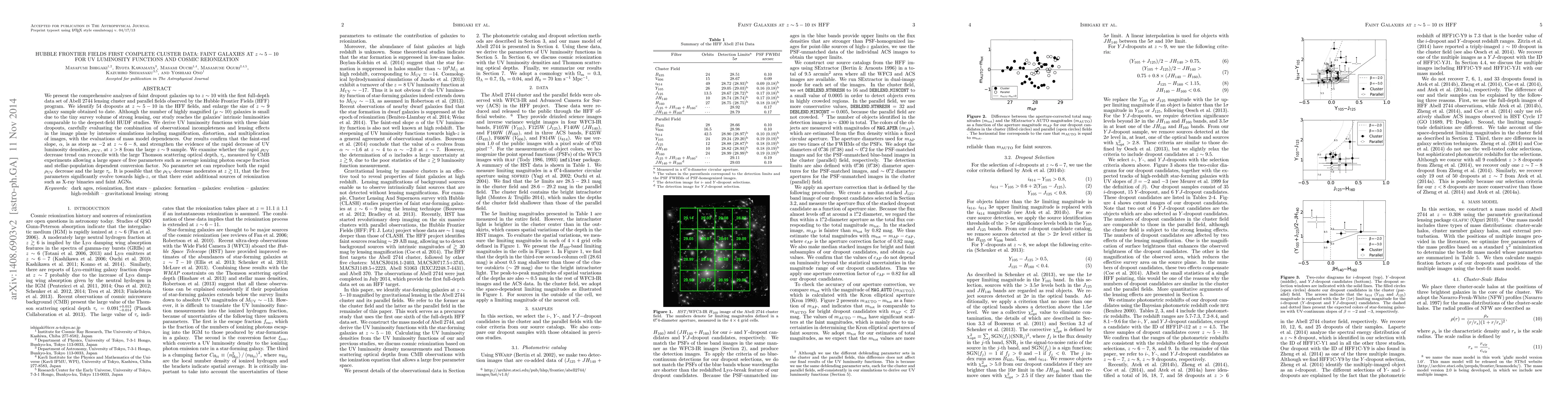 The study utilizes comprehensive analyses of faint dropout galaxies up to $z\\sim10$ with the first full-depth data set of Abell 2744 lensing cluster and parallel fields observed by the Hubble Frontier Fields (HFF) program, employing intensive simulations to evaluate observational incompleteness and lensing effects.