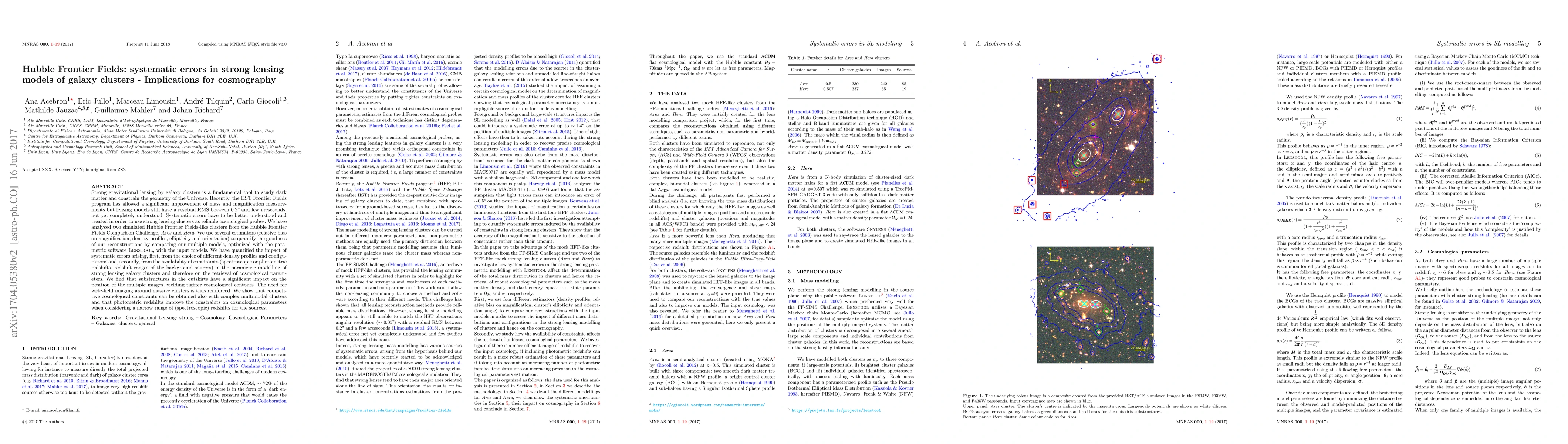 Strong gravitational lensing by galaxy clusters is a fundamental tool to study dark matter and constrain the geometry of the Universe. Recently, the Hubble Space Telescope Frontier Fields programme has allowed a significant improvement of mass and magnification measurements but lensing models still have a residual root mean square between 0.2 arcsec and few arcsec- onds, not yet completely understood. Systematic errors have to be better understood and treated in order to use strong lensing clusters as reliable cosmological probes. We have analysed two simulated Hubble-Frontier-Fields-like clusters from the Hubble Frontier Fields Comparison Challenge, Ares and Hera. We use several estimators (relative bias on magnification, den- sity profiles, ellipticity and orientation) to quantify the goodness of our reconstructions by comparing our multiple models, optimized with the parametric software LENSTOOL , with the input models. We have quantified the impact of systematic errors arising, first, from the choice of different density profiles and configurations and, secondly, from the availability of con- straints (spectroscopic or photometric redshifts, redshift ranges of the background sources) in the parametric modelling of strong lensing galaxy clusters and therefore on the retrieval of cosmological parameters. We find that substructures in the outskirts have a significant im- pact on the position of the multiple images, yielding tighter cosmological contours. The need for wide-field imaging around massive clusters is thus reinforced. We show that competitive cosmological constraints can be obtained also with complex multimodal clusters and that photometric redshifts improve the constraints on cosmological parameters when considering a narrow range of (spectroscopic) redshifts for the sources.