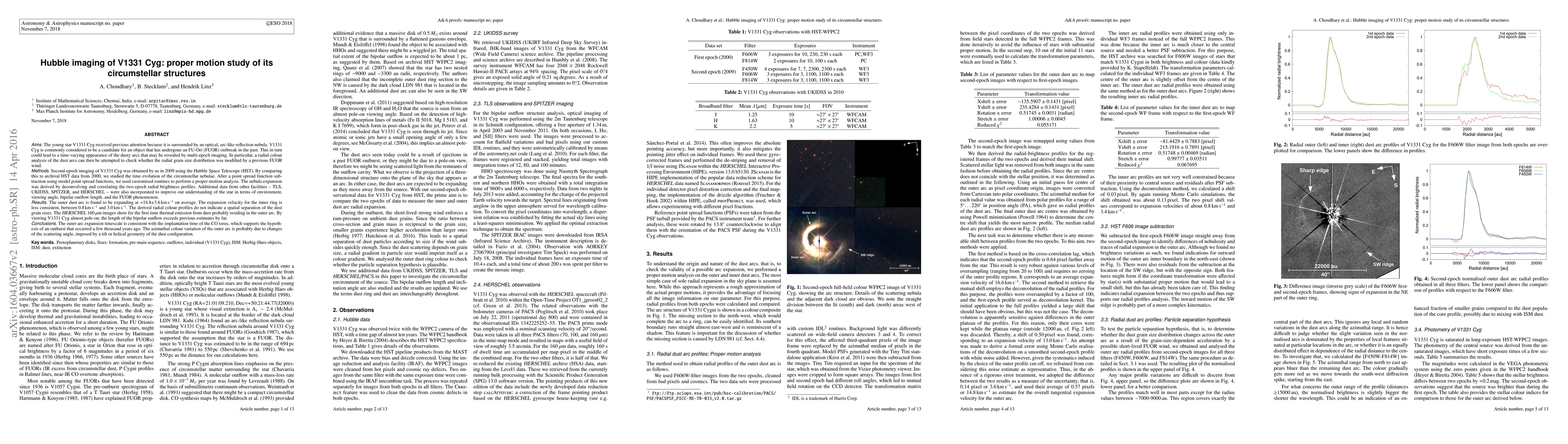 The young star V1331 Cyg received previous attention because it is surrounded by an optical, arc-like reflection nebula. V1331 Cyg is commonly considered to be a candidate for an object that has undergone an FU-Ori (FUOR) the outbreak in the past. This in turn could lead to a time-varying appearance of the dusty arcs that may be revealed by multi-epoch imaging. In particular, a radial colour analysis of the dust arcs can then be attempted to check whether radial grain size distribution was modified by a previous FUOR wind. Second-epoch imaging of V1331 Cyg was obtained by us in 2009 using the Hubble Space Telescope (HST). By comparing this to archival HST data from 2000, we studied the time evolution of the circumstellar nebulae. After a point spread function subtraction using model point spread functions, we used customised routines to perform a proper motion analysis. The nebula expansion was first derived by deconvolving and correlating the two-epoch radial brightness profiles. Additional data from other facilities TLS, UKIDSS, SPITZER, and HERSCHEL were also incorporated to improve our understanding of the star in terms of environment, viewing angle, bipolar outflow length, and the FUOR phenomenon. The derived radial colour profiles do not indicate a spatial separation of the dust grain sizes. The HERSCHEL 160 micron images show for the time thermal emission from dust probably residing in the outer arc. By viewing V1331 Cyg almost pole-on, the length of the bipolar outflow exceeds previous estimates by far. The outer arc expansion timescale is consistent with the implantation time of the CO torus, which supports the hypothesis of an outburst that occurred a few thousand years ago. The azimuthal colour variation of the outer arc is probably due to changes of the scattering angle, imposed by a tilt or helical geometry of the dust configuration.
