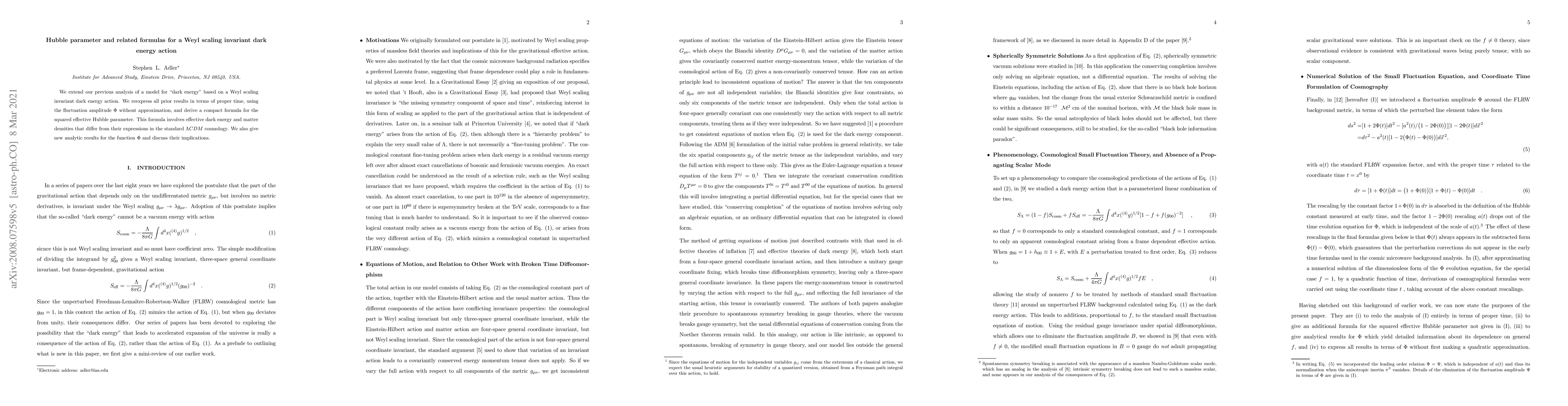 We extend our previous analysis of a model for "dark energy" based on a Weyl scaling invariant dark energy action. We reexpress all prior results in terms of proper time, using the fluctuation amplitude $\Phi$ without approximation, and derive a compact formula for the squared effective Hubble parameter. This formula involves effective dark energy and matter densities that differ from their expressions in the standard $\Lambda CDM$ cosmology. We also give new analytic results for the function $ \Phi$ and discuss their implications.