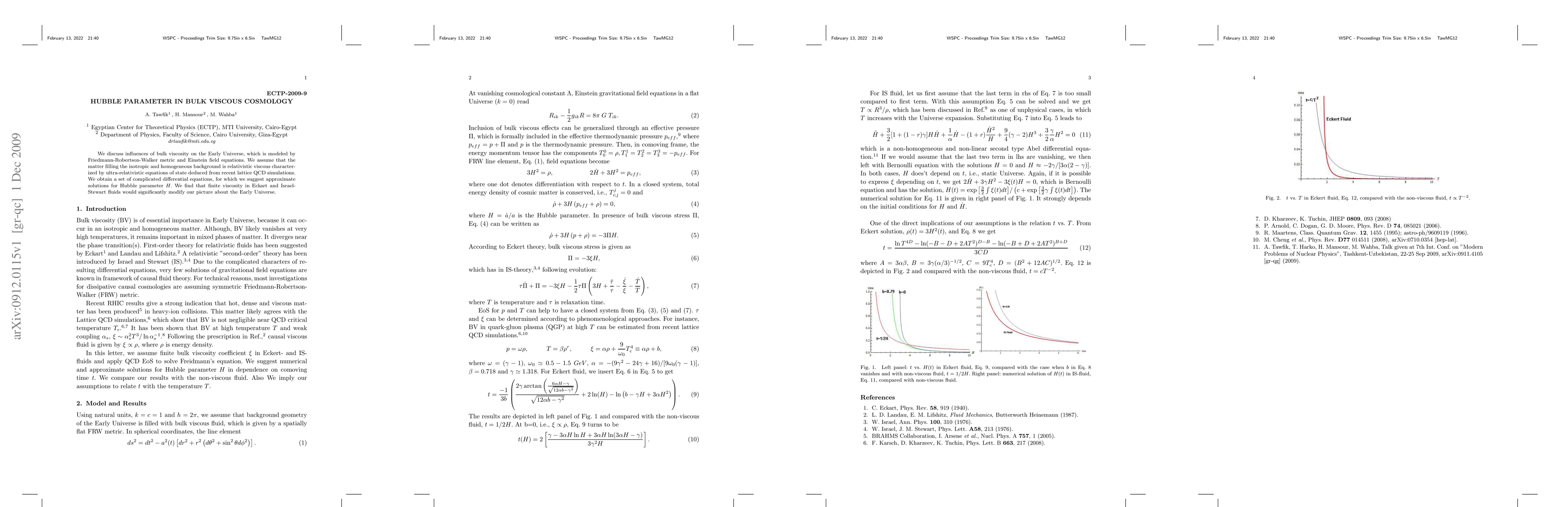 We discuss influences of bulk viscosity on the Early Universe, which is modeled by Friedmann-Robertson-Walker metric and Einstein field equations. We assume that the matter filling the isotropic and homogeneous background is relativistic viscous characterized by ultra-relativistic equations of state deduced from recent lattice QCD simulations. We obtain a set of complicated differential equations, for which we suggest approximate solutions for Hubble parameter $H$. We find that finite viscosity in Eckart and Israel-Stewart fluids would significantly modify our picture about the Early Universe.