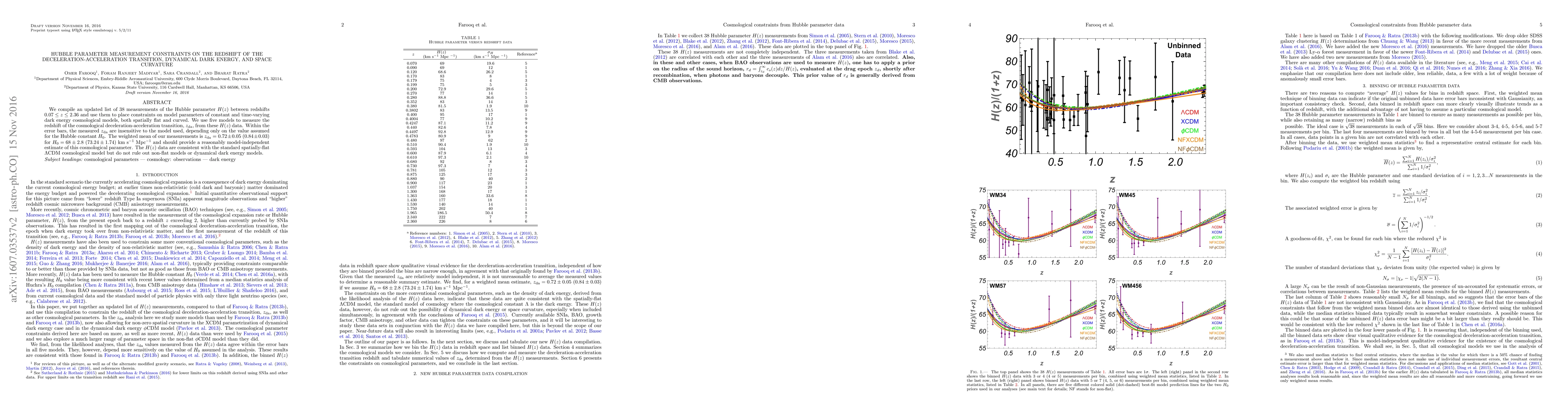 We compile an updated list of 38 measurements of the Hubble parameter $H(z)$ between redshifts $0.07 \leq z \leq 2.36$ and use them to place constraints on model parameters of constant and time-varying dark energy cosmological models, both spatially flat and curved. We use five models to measure the redshift of the cosmological deceleration-acceleration transition, $z_{\rm da}$, from these $H(z)$ data. Within the error bars, the measured $z_{\rm da}$ are insensitive to the model used, depending only on the value assumed for the Hubble constant $H_0$. The weighted mean of our measurements is $z_{\rm da} = 0.72 \pm 0.05\ (0.84 \pm 0.03)$ for $H_0 = 68 \pm 2.8\ (73.24 \pm 1.74)$ km s$^{-1}$ Mpc$^{-1}$ and should provide a reasonably model-independent estimate of this cosmological parameter. The $H(z)$ data are consistent with the standard spatially-flat $\Lambda$CDM cosmological model but do not rule out non-flat models or dynamical dark energy models.