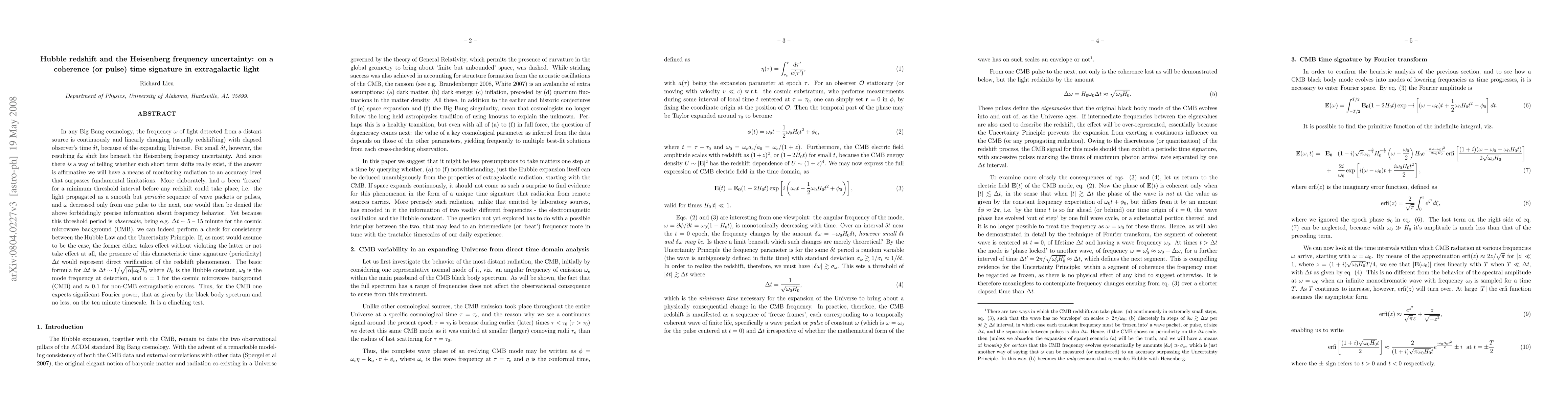 In any Big Bang cosmology, the frequency $\omega$ of light detected from a distant source is continuously and linearly changing (usually redshifting) with elapsed observer's time $\delta t$, because of the expanding Universe. For small $\delta t$, however, the resulting $\delta\omega$ shift lies beneath the Heisenberg frequency uncertainty. And since there {\it is} a way of telling whether such short term shifts really exist, if the answer is affirmative we will have a means of monitoring radiation to an accuracy level that surpasses fundamental limitations. More elaborately, had $\omega$ been `frozen' for a minimum threshold interval before any redshift could take place, i.e. the light propagated as a smooth but {\it periodic} sequence of wave packets or pulses, and $\omega$ decreased only from one pulse to the next, one would then be denied the above forbiddingly precise information about frequency behavior. Yet because this threshold period is {\it observable}, being $\Delta t \approx 1/\sqrt{\omega_0 H_0} \sim$ 5 -- 15 minute for the cosmic microwave background (CMB), we can indeed perform a check for consistency between the Hubble Law and the Uncertainty Principle. If, as most would assume to be the case, the former either takes effect without violating the latter or not take effect at all, the presence of this characteristic time signature (periodicity) $\Delta t$ would represent direct verification of the redshift phenomenon.