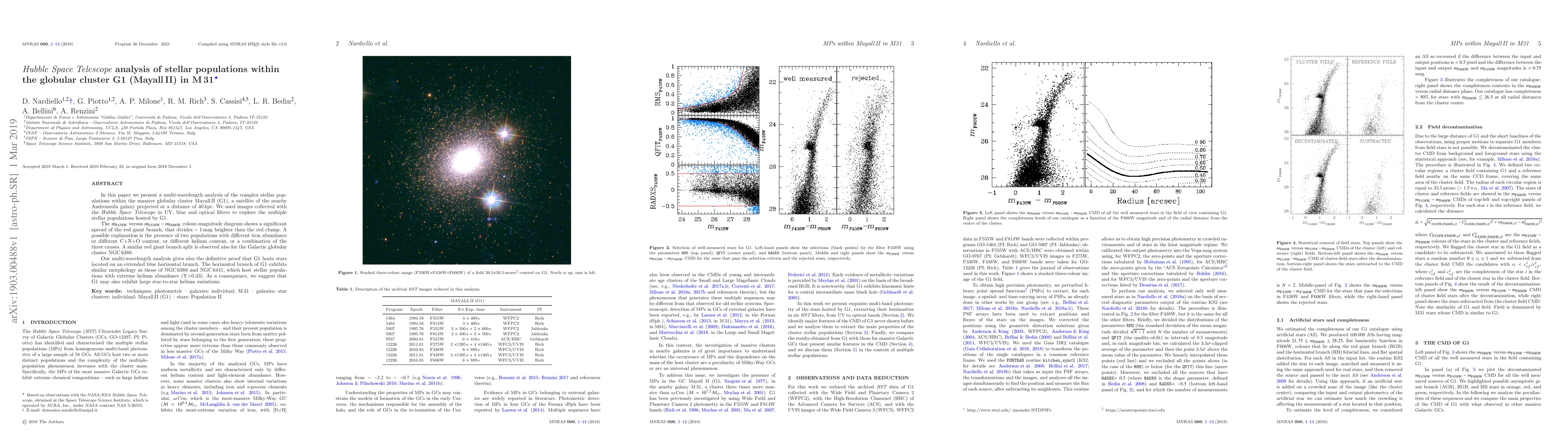 In this paper we present a multi-wavelength analysis of the complex stellar populations within the massive globular cluster Mayall II (G1), a satellite of the nearby Andromeda galaxy projected at a distance of 40 kpc. We used images collected with the Hubble Space Telescope in UV, blue and optical filters to explore the multiple stellar populations hosted by G1. The $m_{\rm F438W}$ versus $m_{\rm F438W}- m_{\rm F606W}$ colour-magnitude diagram shows a significant spread of the red giant branch, that divides $\sim 1$ mag brighter than the red clump. A possible explanation is the presence of two populations with different iron abundance or different C+N+O content, or different helium content, or a combination of the three causes. A similar red giant branch split is observed also for the Galactic globular cluster NGC6388. Our multi-wavelength analysis gives also the definitive proof that G1 hosts stars located on an extended blue horizontal branch. The horizontal branch of G1 exhibits similar morphology as those of NGC6388 and NGC6441, which host stellar populations with extreme helium abundance (Y>0.33). As a consequence, we suggest that G1 may also exhibit large star-to-star helium variations.