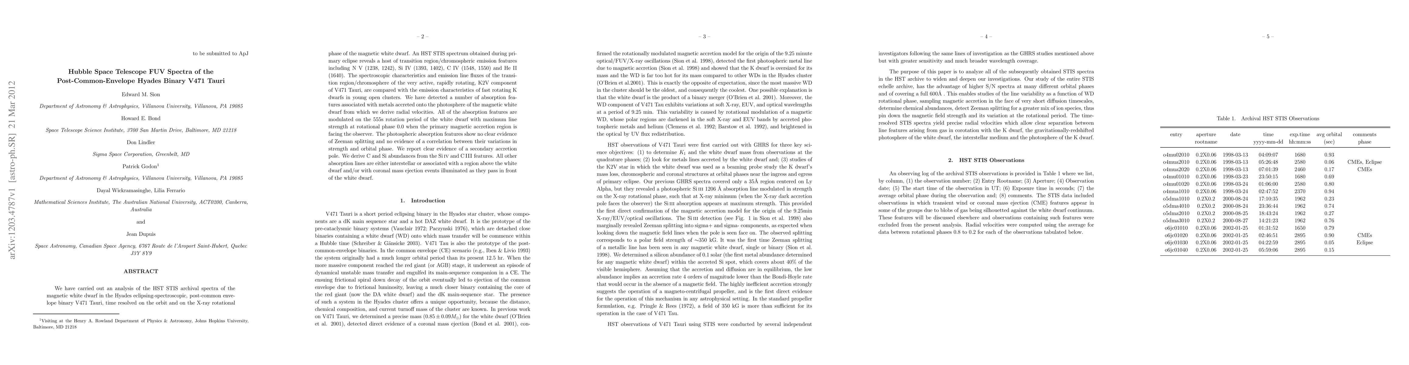 We have carried out an analysis of the HST STIS archival spectra of the magnetic white dwarf in the Hyades eclipsing-spectroscopic, post-common envelope binary V471 Tauri, time resolved on the orbit and on the X-ray rotational phase of the magnetic white dwarf. An HST STIS spectrum obtained during primary eclipse reveals a host of transition region/chromospheric emission features including N V (1238, 1242), Si IV (1393, 1402), C IV (1548, 1550) and He II (1640). The spectroscopic characteristics and emission line fluxes of the transition region/chromosphere of the very active, rapidly rotating, K2V component of V471 Tauri, are compared with the emission characteristics of fast rotating K dwarfs in young open clusters. We have detected a number of absorption features associated with metals accreted onto the photosphere of the magnetic white dwarf from which we derive radial velocities. All of the absorption features are modulated on the 555s rotation period of the white dwarf with maximum line strength at rotational phase 0.0 when the primary magnetic accretion region is facing the observer. The photospheric absorption features show no clear evidence of Zeeman splitting and no evidence of a correlation between their variations in strength and orbital phase. We report clear evidence of a secondary accretion pole. We derive C and Si abundances from the Si IV and C III features. All other absorption lines are either interstellar or associated with a region above the white dwarf and/or with coronal mass ejection events illuminated as they pass in front of the white dwarf.